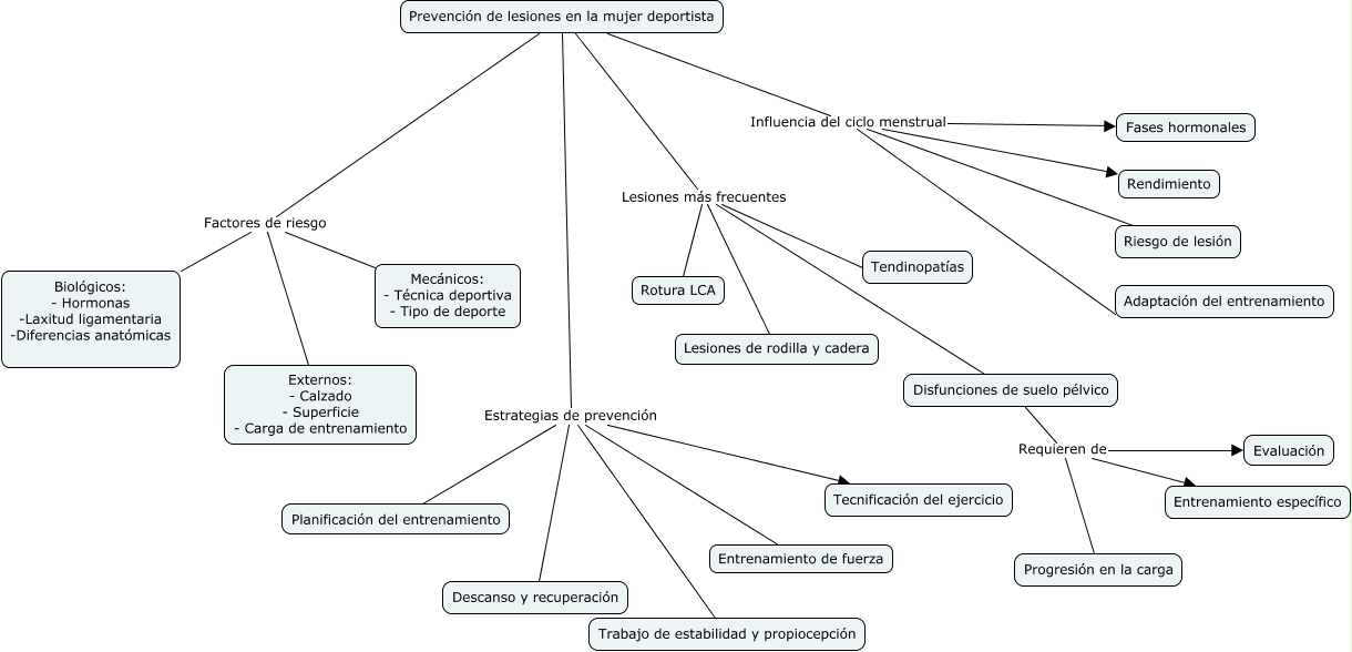 Este Cmap, tiene información relacionada con: Prevención lesiones, Prevención de lesiones en la mujer deportista Lesiones más frecuentes Disfunciones de suelo pélvico, Prevención de lesiones en la mujer deportista Estrategias de prevención Descanso y recuperación, Prevención de lesiones en la mujer deportista Influencia del ciclo menstrual Rendimiento, Prevención de lesiones en la mujer deportista Estrategias de prevención Planificación del entrenamiento, Disfunciones de suelo pélvico Requieren de Entrenamiento específico, Prevención de lesiones en la mujer deportista Influencia del ciclo menstrual Fases hormonales, Prevención de lesiones en la mujer deportista Estrategias de prevención Trabajo de estabilidad y propiocepción, Prevención de lesiones en la mujer deportista Lesiones más frecuentes Tendinopatías, Prevención de lesiones en la mujer deportista Lesiones más frecuentes Rotura LCA, Prevención de lesiones en la mujer deportista Factores de riesgo Mecánicos: - Técnica deportiva - Tipo de deporte, Prevención de lesiones en la mujer deportista Lesiones más frecuentes Lesiones de rodilla y cadera, Prevención de lesiones en la mujer deportista Factores de riesgo Biológicos: - Hormonas -Laxitud ligamentaria -Diferencias anatómicas, Prevención de lesiones en la mujer deportista Influencia del ciclo menstrual Adaptación del entrenamiento, Prevención de lesiones en la mujer deportista Estrategias de prevención Tecnificación del ejercicio, Prevención de lesiones en la mujer deportista Factores de riesgo Externos: - Calzado - Superficie - Carga de entrenamiento, Disfunciones de suelo pélvico Requieren de Progresión en la carga, Prevención de lesiones en la mujer deportista Influencia del ciclo menstrual Riesgo de lesión, Prevención de lesiones en la mujer deportista Estrategias de prevención Entrenamiento de fuerza, Disfunciones de suelo pélvico Requieren de Evaluación