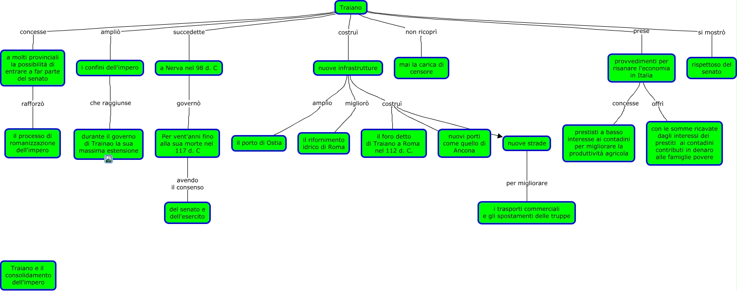 Questa Cmap, creata con IHMC CmapTools, contiene informazioni relative a: Traiano e il consolidamento dell'impero, Traiano costruì nuove infrastrutture, a molti provinciali la possibilità di entrare a far parte del senato rafforzò il processo di romanizzazione dell'impero, nuove infrastrutture costruì il foro detto di Traiano a Roma nel 112 d. C., provvedimenti per risanare l'economia in Italia concesse prestisti a basso interesse ai contadini per migliorare la produttività agricola, Traiano ampliò i confini dell'impero, i confini dell'impero che raggiunse durante il governo di Trainao la sua massima estensione, nuove infrastrutture migliorò il rifornimento idrico di Roma, Traiano si mostrò rispettoso del senato, nuove infrastrutture amplio il porto di Ostia, Traiano succedette a Nerva nel 98 d. C, nuove infrastrutture costruì nuovi porti come quello di Ancona, Per vent'anni fino alla sua morte nel 117 d. C avendo il consenso del senato e dell'esercito, provvedimenti per risanare l'economia in Italia offrì con le somme ricavate dagli interessi dei prestiti ai contadini contributi in denaro alle famiglie povere, nuove strade per migliorare i trasporti commerciali e gli spostamenti delle truppe, a Nerva nel 98 d. C governò Per vent'anni fino alla sua morte nel 117 d. C, Traiano non ricoprì mai la carica di censore, Traiano concesse a molti provinciali la possibilità di entrare a far parte del senato, Traiano prese provvedimenti per risanare l'economia in Italia, nuove infrastrutture costruì nuove strade