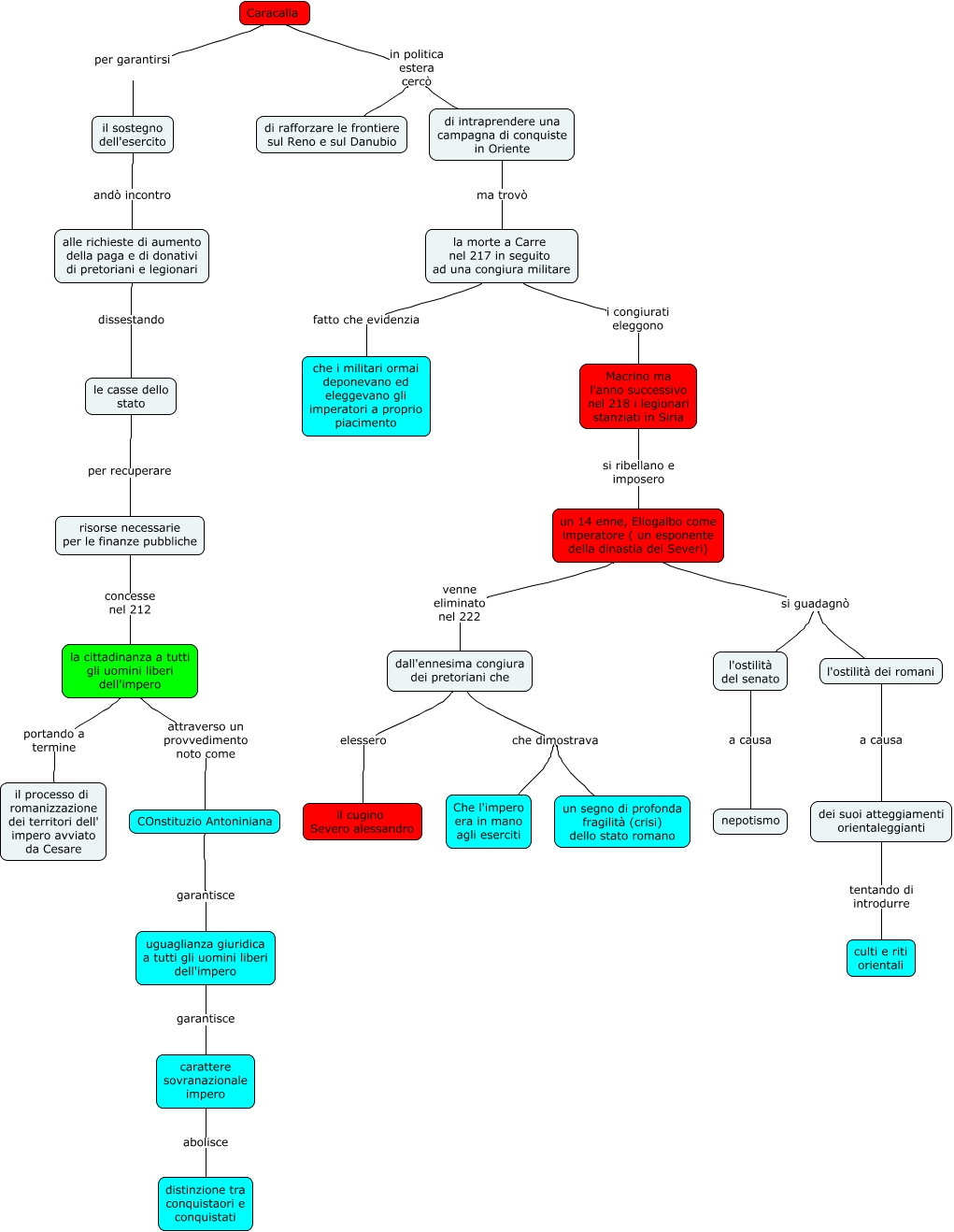 Questa Cmap, creata con IHMC CmapTools, contiene informazioni relative a: L'impero in mano agli eserciti, carattere sovranazionale impero abolisce distinzione tra conquistaori e conquistati, di intraprendere una campagna di conquiste in Oriente ma trovò la morte a Carre nel 217 in seguito ad una congiura militare, l'ostilità dei romani a causa dei suoi atteggiamenti orientaleggianti, uguaglianza giuridica a tutti gli uomini liberi dell'impero garantisce carattere sovranazionale impero, Caracalla per garantirsi il sostegno dell'esercito, un 14 enne, Eliogalbo come imperatore ( un esponente della dinastia dei Severi) venne eliminato nel 222 dall'ennesima congiura dei pretoriani che, le casse dello stato per recuperare risorse necessarie per le finanze pubbliche, COnstituzio Antoniniana garantisce uguaglianza giuridica a tutti gli uomini liberi dell'impero, la cittadinanza a tutti gli uomini liberi dell'impero attraverso un provvedimento noto come COnstituzio Antoniniana, la cittadinanza a tutti gli uomini liberi dell'impero portando a termine il processo di romanizzazione dei territori dell' impero avviato da Cesare, Caracalla in politica estera cercò di rafforzare le frontiere sul Reno e sul Danubio, un 14 enne, Eliogalbo come imperatore ( un esponente della dinastia dei Severi) si guadagnò l'ostilità dei romani, risorse necessarie per le finanze pubbliche concesse nel 212 la cittadinanza a tutti gli uomini liberi dell'impero, il sostegno dell'esercito andò incontro alle richieste di aumento della paga e di donativi di pretoriani e legionari, la morte a Carre nel 217 in seguito ad una congiura militare i congiurati eleggono Macrino ma l'anno successivo nel 218 i legionari stanziati in Siria, dall'ennesima congiura dei pretoriani che che dimostrava Che l'impero era in mano agli eserciti, l'ostilità del senato a causa nepotismo, dei suoi atteggiamenti orientaleggianti tentando di introdurre culti e riti orientali, alle richieste di aumento della paga e di donativi di pretoriani e legionari dissestando le casse dello stato, dall'ennesima congiura dei pretoriani che elessero il cugino Severo alessandro