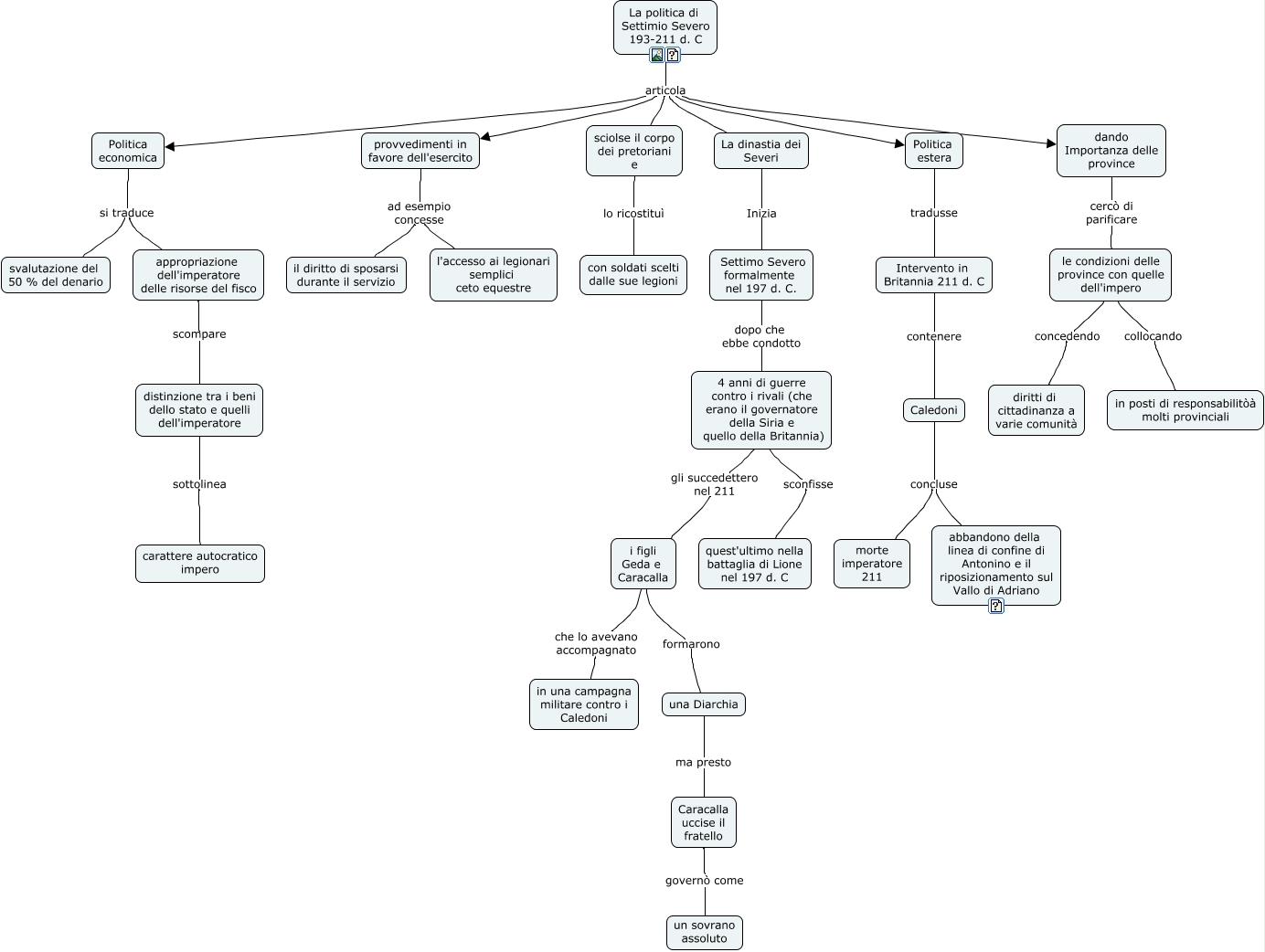 Questa Cmap, creata con IHMC CmapTools, contiene informazioni relative a: Settimo Severo, le condizioni delle province con quelle dell'impero concedendo diritti di cittadinanza a varie comunità, Politica estera tradusse Intervento in Britannia 211 d. C, Politica economica si traduce appropriazione dell'imperatore delle risorse del fisco, La politica di Settimio Severo 193-211 d. C articola La dinastia dei Severi, i figli Geda e Caracalla che lo avevano accompagnato in una campagna militare contro i Caledoni, Caledoni concluse morte imperatore 211, i figli Geda e Caracalla formarono una Diarchia, La politica di Settimio Severo 193-211 d. C articola dando Importanza delle province, La politica di Settimio Severo 193-211 d. C articola Politica estera, dando Importanza delle province cercò di parificare le condizioni delle province con quelle dell'impero, provvedimenti in favore dell'esercito ad esempio concesse il diritto di sposarsi durante il servizio, 4 anni di guerre contro i rivali (che erano il governatore della Siria e quello della Britannia) sconfisse quest'ultimo nella battaglia di Lione nel 197 d. C, Politica economica si traduce svalutazione del 50 % del denario, 4 anni di guerre contro i rivali (che erano il governatore della Siria e quello della Britannia) gli succedettero nel 211 i figli Geda e Caracalla, La politica di Settimio Severo 193-211 d. C articola provvedimenti in favore dell'esercito, Caledoni concluse abbandono della linea di confine di Antonino e il riposizionamento sul Vallo di Adriano, le condizioni delle province con quelle dell'impero collocando in posti di responsabilitòà molti provinciali, una Diarchia ma presto Caracalla uccise il fratello, Settimo Severo formalmente nel 197 d. C. dopo che ebbe condotto 4 anni di guerre contro i rivali (che erano il governatore della Siria e quello della Britannia), Caracalla uccise il fratello governò come un sovrano assoluto