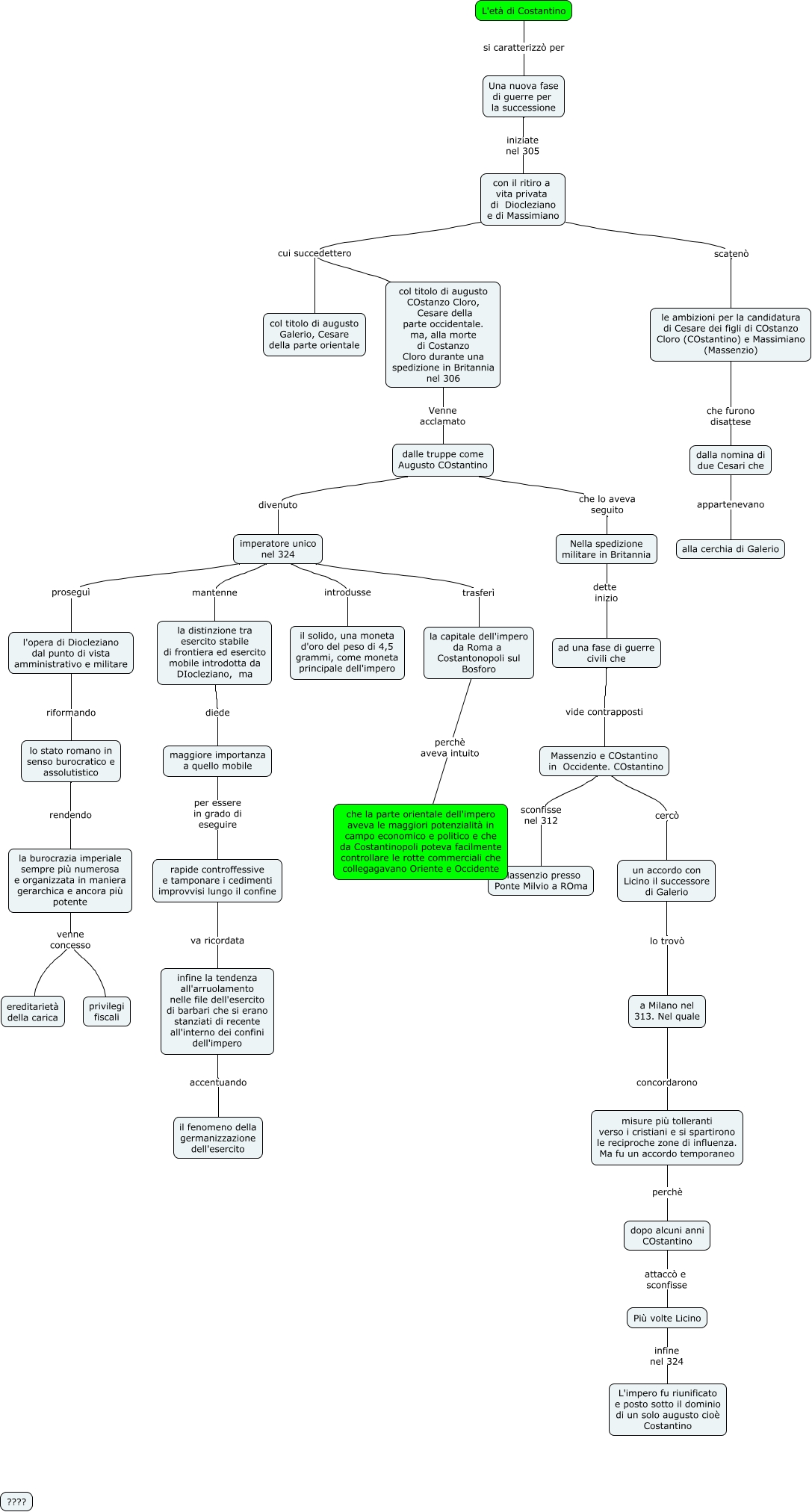 Questa Cmap, creata con IHMC CmapTools, contiene informazioni relative a: L'età di Costantino, ad una fase di guerre civili che vide contrapposti Massenzio e COstantino in Occidente. COstantino, la burocrazia imperiale sempre più numerosa e organizzata in maniera gerarchica e ancora più potente venne concesso privilegi fiscali, imperatore unico nel 324 proseguì l'opera di Diocleziano dal punto di vista amministrativo e militare, a Milano nel 313. Nel quale concordarono misure più tolleranti verso i cristiani e si spartirono le reciproche zone di influenza. Ma fu un accordo temporaneo, Massenzio e COstantino in Occidente. COstantino sconfisse nel 312 Massenzio presso Ponte Milvio a ROma, L'età di Costantino si caratterizzò per Una nuova fase di guerre per la successione, le ambizioni per la candidatura di Cesare dei figli di COstanzo Cloro (COstantino) e Massimiano (Massenzio) che furono disattese dalla nomina di due Cesari che, dalla nomina di due Cesari che appartenevano alla cerchia di Galerio, imperatore unico nel 324 trasferì la capitale dell'impero da Roma a Costantonopoli sul Bosforo, Nella spedizione militare in Britannia dette inizio ad una fase di guerre civili che, la capitale dell'impero da Roma a Costantonopoli sul Bosforo perchè aveva intuito che la parte orientale dell'impero aveva le maggiori potenzialità in campo economico e politico e che da Costantinopoli poteva facilmente controllare le rotte commerciali che collegagavano Oriente e Occidente, lo stato romano in senso burocratico e assolutistico rendendo la burocrazia imperiale sempre più numerosa e organizzata in maniera gerarchica e ancora più potente, imperatore unico nel 324 mantenne la distinzione tra esercito stabile di frontiera ed esercito mobile introdotta da DIocleziano, ma, l'opera di Diocleziano dal punto di vista amministrativo e militare riformando lo stato romano in senso burocratico e assolutistico, imperatore unico nel 324 introdusse il solido, una moneta d'oro del peso di 4,5 grammi, come moneta principale dell'impero, la distinzione tra esercito stabile di frontiera ed esercito mobile introdotta da DIocleziano, ma diede maggiore importanza a quello mobile, con il ritiro a vita privata di Diocleziano e di Massimiano cui succedettero col titolo di augusto Galerio, Cesare della parte orientale, Una nuova fase di guerre per la successione iniziate nel 305 con il ritiro a vita privata di Diocleziano e di Massimiano, col titolo di augusto COstanzo Cloro, Cesare della parte occidentale. ma, alla morte di Costanzo Cloro durante una spedizione in Britannia nel 306 Venne acclamato dalle truppe come Augusto COstantino, un accordo con Licino il successore di Galerio lo trovò a Milano nel 313. Nel quale