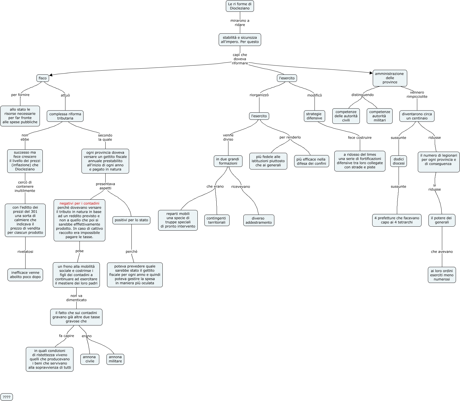 Questa Cmap, creata con IHMC CmapTools, contiene informazioni relative a: Le riforme di Diocleziano, in due grandi formazioni che erano contingenti territoriali, il fatto che sui contadini gravano già altre due tasse gravose che erano annona civile, strategie difensive fece costruire a ridosso del limes una serie di fortificazioni difensive tra loro collegate con strade e piste, il numero di legionari per ogni provincia e di conseguenza si ridusse il potere dei generali, complessa riforma tributaria non ebbe successo ma fece crescere il livello dei prezzi (inflazione) che Diocleziano, l'esercito per renderlo più efficace nella difesa dei confini, fisco per fornire allo stato le risorse necessarie per far fronte alle spese pubbliche, fisco attuò complessa riforma tributaria, il fatto che sui contadini gravano già altre due tasse gravose che erano annona militare, un freno alla mobilità sociale e costrinse i figli dei contadini a continuare ad esercitare il mestiere dei loro padri non va dimenticato il fatto che sui contadini gravano già altre due tasse gravose che, dodici diocesi sussunte 4 prefetture che facevano capo ai 4 tetrarchi, stabilità e sicurezza all'impero. Per questo capì che doveva riformare fisco, diventarono circa un centinaio sussunte dodici diocesi, con l'editto dei prezzi del 301 una sorta di calmiere che indicava il prezzo di vendita per ciascun prodotto rivelatosi inefficace venne abolito poco dopo, amministrazione delle province vennero rimpicciolite diventarono circa un centinaio, il fatto che sui contadini gravano già altre due tasse gravose che fa capire in quali condizioni di ristettezza viveno quelli che producevano i beni che servivano alla sopravvienza di tutti, positivi per lo stato perchè poteva prevedere quale sarebbe stato il gettito fiscale per ogni anno e quindi poteva gestire la spesa in maniera più oculata, l'esercito venne diviso in due grandi formazioni, amministrazione delle province distinguendo competenze autorità militari, stabilità e sicurezza all'impero. Per questo capì che doveva riformare amministrazione delle province