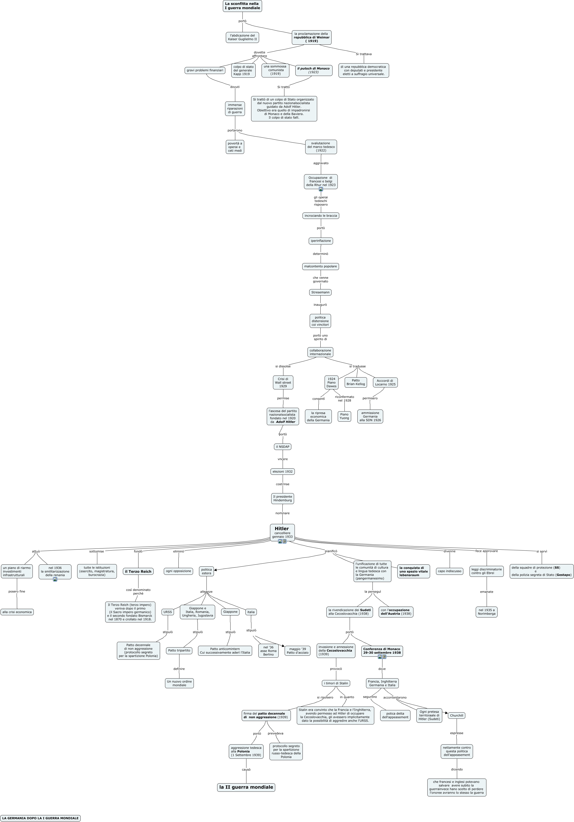 Questa Cmap, creata con IHMC CmapTools, contiene informazioni relative a: la fine della repubblica di Weimar e il nazismo parte seconda, Stresemann inaugurò politica distensione coi vincitori, Il presidente Hindemburg nominare Hitler cancelliere gennaio 1933, Acccordi di Locarno 1925 permisero ammissione Germania alla SDN 1926, l'ascesa del partito nazionalsocialista fondato nel 1920 da Adolf Hitler portò il NSDAP, collaborazione internazionale si dissolse Crisi di Wall street 1929, Giappone e Italia, Romania, Ungheria, Jugoslavia stipulò Patto tripartito, Patto tripartito definire Un nuovo ordine mondiale, Francia, Inghilterra Germania e Italia segurono potica detta dell'appeasement, la rivendicazione dei Sudeti alla Cecoslovacchia (1938) portò invasione e annessione della Cecoslovacchia (1939), leggi discriminatorie contro gli Ebrei emanate nel 1935 a Norimberga, Hitler cancelliere gennaio 1933 pianificò politica estera, la proclamazione della repubblica di Weimar ( 1919) dovette affrontare il putsch di Monaco (1923), collaborazione internazionale si tradusse Acccordi di Locarno 1925, politica estera alleanze Giappone e Italia, Romania, Ungheria, Jugoslavia, la proclamazione della repubblica di Weimar ( 1919) dovette affrontare una sommossa comunista (1919), la proclamazione della repubblica di Weimar ( 1919) dovette affrontare colpo di stato del generale Kapp 1919, un piano di riarmo investimenti infrastrutturali posero fine alla crisi economica, Hitler cancelliere gennaio 1933 si servì della squadre di protezione (SS) e della polizia segreta di Stato (Gestapo), 1924 Piano Dawes consentì la ripresa economica della Germania, collaborazione internazionale si tradusse 1924 Piano Dawes