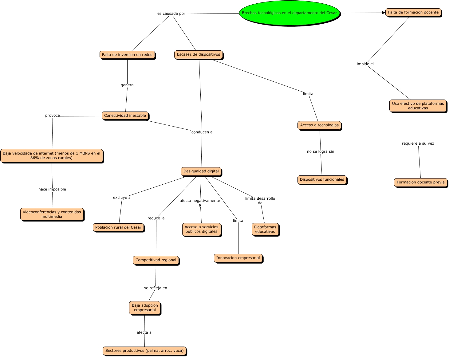 Este Cmap, tiene información relacionada con: Brechas tecnologicas en el departamento del cesar, Acceso a tecnologias no se logra sin Dispositivos funcionales, Escasez de dispositivos limita Acceso a tecnologias, Competitivad regional se refleja en Baja adopcion empresarial, Desigualdad digital excluye a Poblacion rural del Cesar, Desigualdad digital afecta negativamente a Acceso a servicios publicos digitales, Brechas tecnológicas en el departamento del Cesar se debe también a Falta de formacion docente, Desigualdad digital limita Innovacion empresarial, Brechas tecnológicas en el departamento del Cesar es causada por Falta de inversion en redes, Desigualdad digital reduce la Competitivad regional, Conectividad inestable provoca Baja velocidade de internet (menos de 1 MBPS en el 86% de zonas rurales), Escasez de dispositivos conducen a Desigualdad digital, Uso efectivo de plataformas educativas requiere a su vez Formacion docente previa, Conectividad inestable conducen a Desigualdad digital, Brechas tecnológicas en el departamento del Cesar es causada por Escasez de dispositivos, Baja adopcion empresarial afecta a Sectores productivos (palma, arroz, yuca), Baja velocidade de internet (menos de 1 MBPS en el 86% de zonas rurales) hace imposible Videoconferencias y contenidos multimedia, Falta de inversion en redes genera Conectividad inestable, Falta de formacion docente impide el Uso efectivo de plataformas educativas, Desigualdad digital limita desarrollo de Plataformas educativas