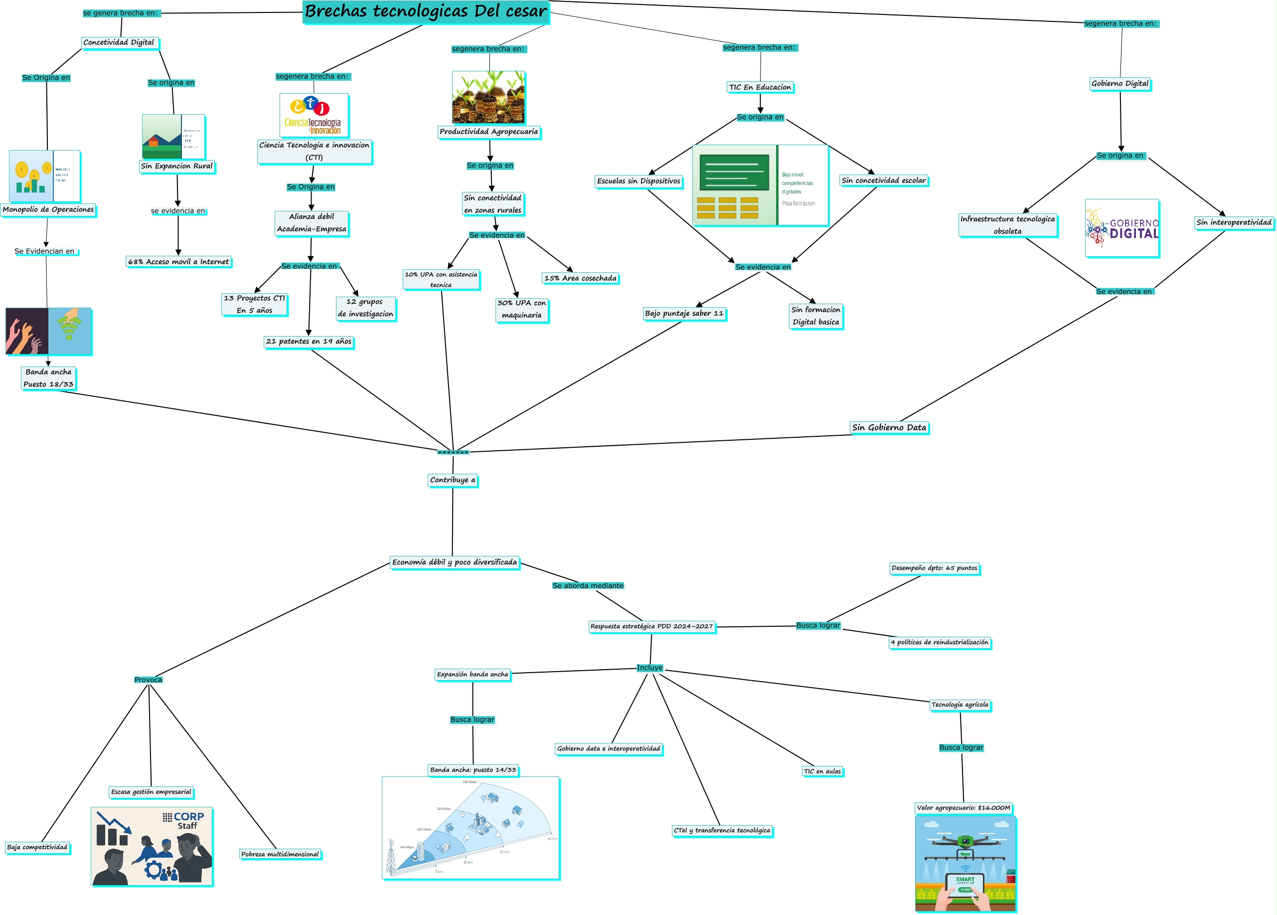 Este Cmap, tiene información relacionada con: punto 1 metodologia, Escuelas sin Dispositivos Se evidencia en Bajo puntaje saber 11, Respuesta estratégica PDD 2024–2027 Incluye Tecnología agrícola, Contribuye a ******* 21 patentes en 19 años, Brechas tecnologicas Del cesar se genera brecha en: Concetividad Digital, Gobierno Digital Se origina en Infraestructura tecnologica obsoleta, Respuesta estratégica PDD 2024–2027 Incluye Expansión banda ancha, Sin interoperatividad Se evidencia en Sin Gobierno Data, Alianza debil Academia-Empresa Se evidencia en 12 grupos de investigacion, Sin conectividad en zonas rurales Se evidencia en 10% UPA con asistencia tecnica, Monopolio de Operaciones Se Evidencian en Banda ancha Puesto 18/33, Sin Expancion Rural se evidencia en 68% Acceso movil a Internet, TIC En Educacion Se origina en Escuelas sin Dispositivos, Brechas tecnologicas Del cesar segenera brecha en: Ciencia Tecnologia e innovacion (CTI), Economía débil y poco diversificada Se aborda mediante Respuesta estratégica PDD 2024–2027, Sin conectividad en zonas rurales Se evidencia en 15% Area cosechada, Respuesta estratégica PDD 2024–2027 Incluye CTeI y transferencia tecnológica, Expansión banda ancha Busca lograr Banda ancha: puesto 14/33, Respuesta estratégica PDD 2024–2027 Busca lograr 4 políticas de reindustrialización, Brechas tecnologicas Del cesar segenera brecha en: Gobierno Digital, Ciencia Tecnologia e innovacion (CTI) Se Origina en Alianza debil Academia-Empresa
