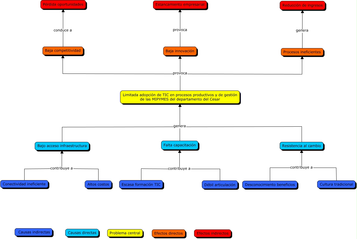 Este Cmap, tiene información relacionada con: Limitada adopción de TIC en procesos productivos y de gestión de las MIPYMES del departamento del Cesar, Bajo acceso infraestructura genera Limitada adopción de TIC en procesos productivos y de gestión de las MIPYMES del departamento del Cesar, Conectividad ineficiente contribuye a Bajo acceso infraestructura, Limitada adopción de TIC en procesos productivos y de gestión de las MIPYMES del departamento del Cesar provoca Baja competitividad, Baja innovación provoca Estancamiento empresarial, Débil articulación contribuye a Falta capacitación, Procesos ineficientes genera Reducción de ingresos, Limitada adopción de TIC en procesos productivos y de gestión de las MIPYMES del departamento del Cesar provoca Procesos ineficientes, Falta capacitación genera Limitada adopción de TIC en procesos productivos y de gestión de las MIPYMES del departamento del Cesar, Resistencia al cambio genera Limitada adopción de TIC en procesos productivos y de gestión de las MIPYMES del departamento del Cesar, Baja competitividad conduce a Pérdida oportunidades, Escasa formación TIC contribuye a Falta capacitación, Altos costos contribuye a Bajo acceso infraestructura, Limitada adopción de TIC en procesos productivos y de gestión de las MIPYMES del departamento del Cesar provoca Baja innovación