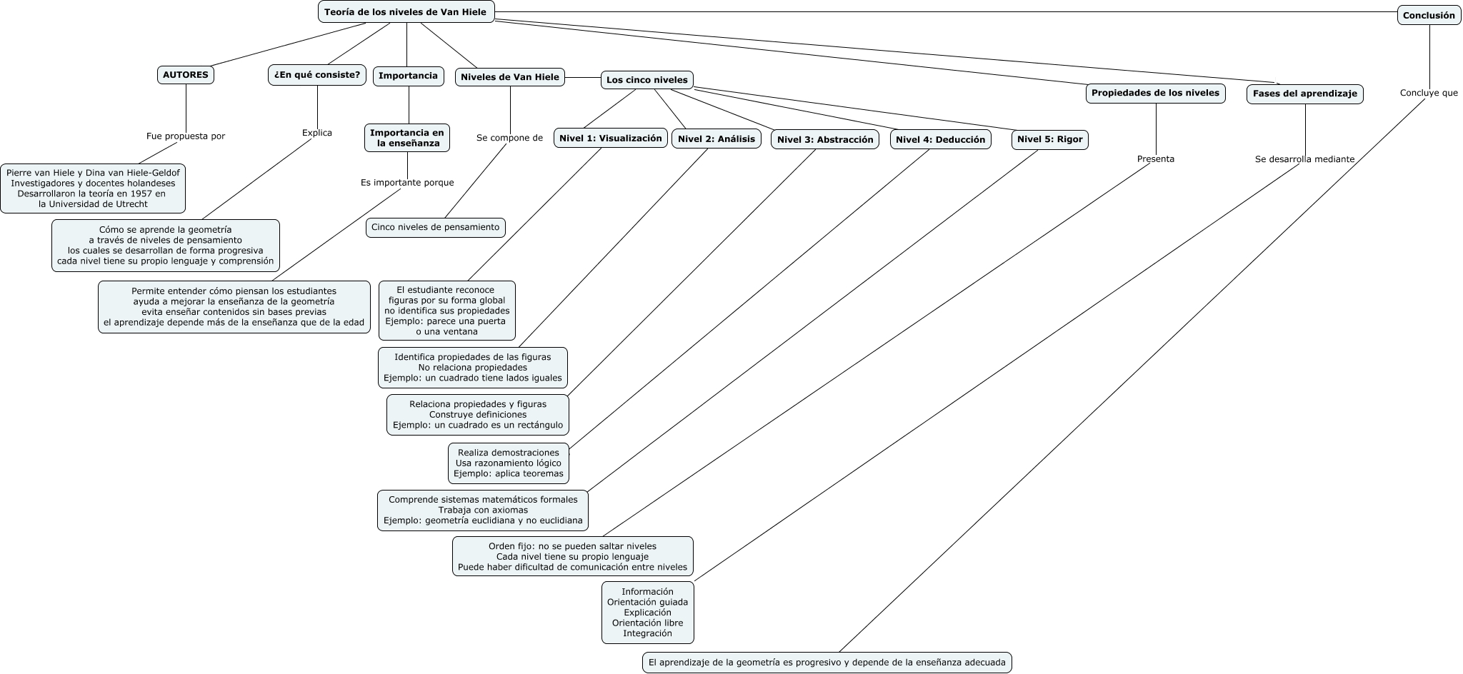 Este Cmap, tiene información relacionada con: Niveles de Van Hiele, Teoría de los niveles de Van Hiele Propiedades de los niveles, Teoría de los niveles de Van Hiele Fases del aprendizaje, Nivel 4: Deducción ???? Realiza demostraciones Usa razonamiento lógico Ejemplo: aplica teoremas, Importancia ???? Importancia en la enseñanza, Nivel 3: Abstracción ???? Relaciona propiedades y figuras Construye definiciones Ejemplo: un cuadrado es un rectángulo, Teoría de los niveles de Van Hiele AUTORES, Nivel 1: Visualización ???? El estudiante reconoce figuras por su forma global no identifica sus propiedades Ejemplo: parece una puerta o una ventana, Los cinco niveles Nivel 3: Abstracción, Fases del aprendizaje Se desarrolla mediante Información Orientación guiada Explicación Orientación libre Integración, Nivel 2: Análisis ???? Identifica propiedades de las figuras No relaciona propiedades Ejemplo: un cuadrado tiene lados iguales, Niveles de Van Hiele Los cinco niveles, Nivel 5: Rigor ???? Comprende sistemas matemáticos formales Trabaja con axiomas Ejemplo: geometría euclidiana y no euclidiana, Los cinco niveles Nivel 5: Rigor, Los cinco niveles ??? Nivel 1: Visualización, Los cinco niveles Nivel 4: Deducción, Niveles de Van Hiele Se compone de Cinco niveles de pensamiento, ¿En qué consiste? Explica Cómo se aprende la geometría a través de niveles de pensamiento los cuales se desarrollan de forma progresiva cada nivel tiene su propio lenguaje y comprensión, Importancia en la enseñanza Es importante porque Permite entender cómo piensan los estudiantes ayuda a mejorar la enseñanza de la geometría evita enseñar contenidos sin bases previas el aprendizaje depende más de la enseñanza que de la edad, AUTORES Fue propuesta por Pierre van Hiele y Dina van Hiele-Geldof Investigadores y docentes holandeses Desarrollaron la teoría en 1957 en la Universidad de Utrecht, Teoría de los niveles de Van Hiele Conclusión