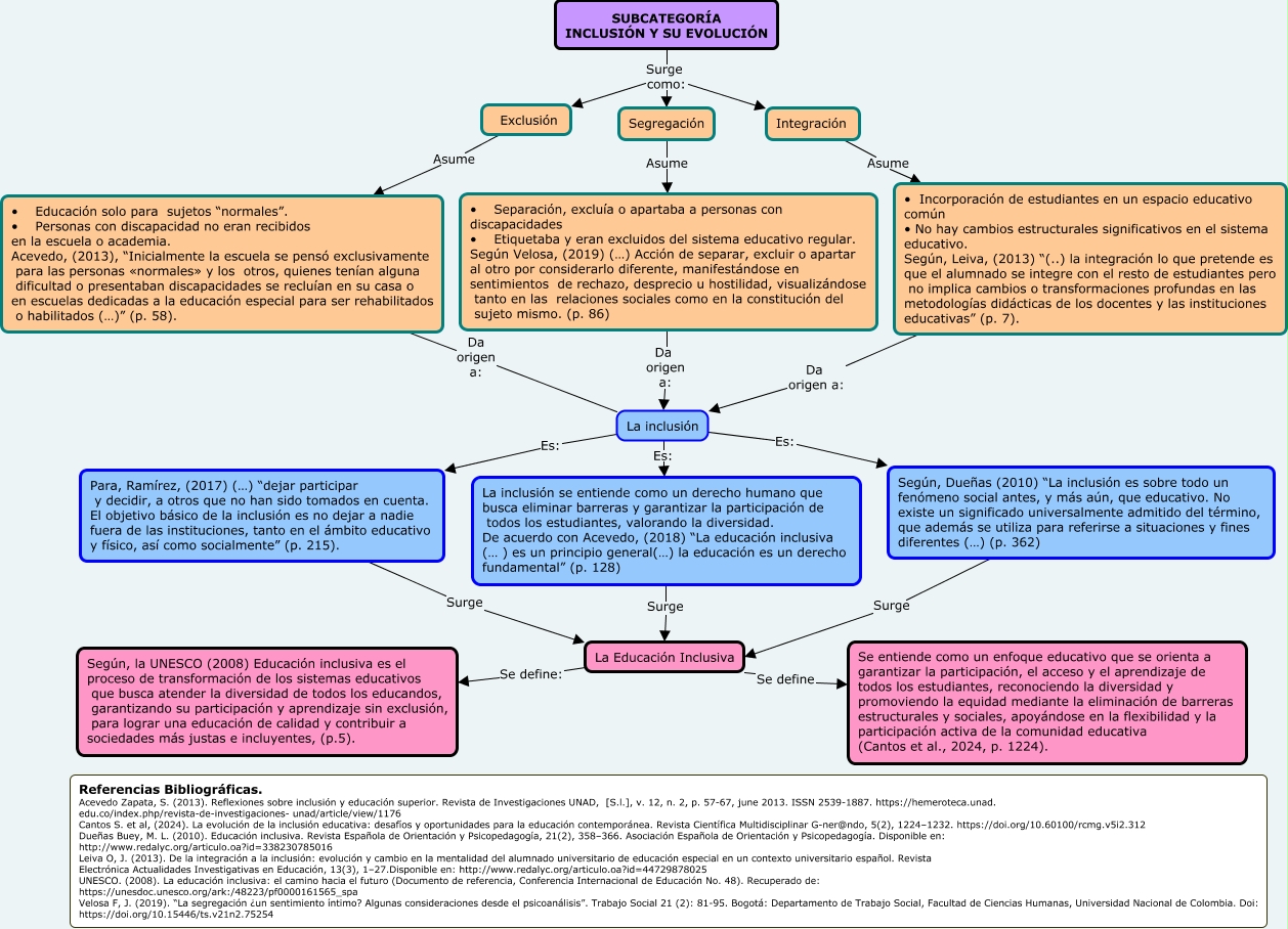 Este Cmap, tiene información relacionada con: Inclusión y su evolución, La inclusión Es: La inclusión se entiende como un derecho humano que busca eliminar barreras y garantizar la participación de todos los estudiantes, valorando la diversidad. De acuerdo con Acevedo, (2018) “La educación inclusiva (… ) es un principio general(…) la educación es un derecho fundamental” (p. 128), • Separación, excluía o apartaba a personas con discapacidades • Etiquetaba y eran excluidos del sistema educativo regular. Según Velosa, (2019) (…) Acción de separar, excluir o apartar al otro por considerarlo diferente, manifestándose en sentimientos de rechazo, desprecio u hostilidad, visualizándose tanto en las relaciones sociales como en la constitución del sujeto mismo. (p. 86) Da origen a: La inclusión, • Educación solo para sujetos “normales”. • Personas con discapacidad no eran recibidos en la escuela o academia. Acevedo, (2013), “Inicialmente la escuela se pensó exclusivamente para las personas «normales» y los otros, quienes tenían alguna dificultad o presentaban discapacidades se recluían en su casa o en escuelas dedicadas a la educación especial para ser rehabilitados o habilitados (…)” (p. 58). Da origen a: La inclusión, SUBCATEGORÍA INCLUSIÓN Y SU EVOLUCIÓN Surge como: Exclusión, SUBCATEGORÍA INCLUSIÓN Y SU EVOLUCIÓN Surge como: Segregación, La inclusión se entiende como un derecho humano que busca eliminar barreras y garantizar la participación de todos los estudiantes, valorando la diversidad. De acuerdo con Acevedo, (2018) “La educación inclusiva (… ) es un principio general(…) la educación es un derecho fundamental” (p. 128) Surge La Educación Inclusiva, Segregación Asume • Separación, excluía o apartaba a personas con discapacidades • Etiquetaba y eran excluidos del sistema educativo regular. Según Velosa, (2019) (…) Acción de separar, excluir o apartar al otro por considerarlo diferente, manifestándose en sentimientos de rechazo, desprecio u hostilidad, visualizándose tanto en las relaciones sociales como en la constitución del sujeto mismo. (p. 86), • Incorporación de estudiantes en un espacio educativo común • No hay cambios estructurales significativos en el sistema educativo. Según, Leiva, (2013) “(..) la integración lo que pretende es que el alumnado se integre con el resto de estudiantes pero no implica cambios o transformaciones profundas en las metodologías didácticas de los docentes y las instituciones educativas” (p. 7). Da origen a: La inclusión, Integración Asume • Incorporación de estudiantes en un espacio educativo común • No hay cambios estructurales significativos en el sistema educativo. Según, Leiva, (2013) “(..) la integración lo que pretende es que el alumnado se integre con el resto de estudiantes pero no implica cambios o transformaciones profundas en las metodologías didácticas de los docentes y las instituciones educativas” (p. 7)., Para, Ramírez, (2017) (…) “dejar participar y decidir, a otros que no han sido tomados en cuenta. El objetivo básico de la inclusión es no dejar a nadie fuera de las instituciones, tanto en el ámbito educativo y físico, así como socialmente” (p. 215). Surge La Educación Inclusiva, Según, Dueñas (2010) “La inclusión es sobre todo un fenómeno social antes, y más aún, que educativo. No existe un significado universalmente admitido del término, que además se utiliza para referirse a situaciones y fines diferentes (…) (p. 362) Surge La Educación Inclusiva, Exclusión Asume • Educación solo para sujetos “normales”. • Personas con discapacidad no eran recibidos en la escuela o academia. Acevedo, (2013), “Inicialmente la escuela se pensó exclusivamente para las personas «normales» y los otros, quienes tenían alguna dificultad o presentaban discapacidades se recluían en su casa o en escuelas dedicadas a la educación especial para ser rehabilitados o habilitados (…)” (p. 58)., SUBCATEGORÍA INCLUSIÓN Y SU EVOLUCIÓN Surge como: Integración, La inclusión Es: Para, Ramírez, (2017) (…) “dejar participar y decidir, a otros que no han sido tomados en cuenta. El objetivo básico de la inclusión es no dejar a nadie fuera de las instituciones, tanto en el ámbito educativo y físico, así como socialmente” (p. 215)., La Educación Inclusiva Se define: Según, la UNESCO (2008) Educación inclusiva es el proceso de transformación de los sistemas educativos que busca atender la diversidad de todos los educandos, garantizando su participación y aprendizaje sin exclusión, para lograr una educación de calidad y contribuir a sociedades más justas e incluyentes, (p.5)., La Educación Inclusiva Se define Se entiende como un enfoque educativo que se orienta a garantizar la participación, el acceso y el aprendizaje de todos los estudiantes, reconociendo la diversidad y promoviendo la equidad mediante la eliminación de barreras estructurales y sociales, apoyándose en la flexibilidad y la participación activa de la comunidad educativa (Cantos et al., 2024, p. 1224)., La inclusión Es: Según, Dueñas (2010) “La inclusión es sobre todo un fenómeno social antes, y más aún, que educativo. No existe un significado universalmente admitido del término, que además se utiliza para referirse a situaciones y fines diferentes (…) (p. 362)