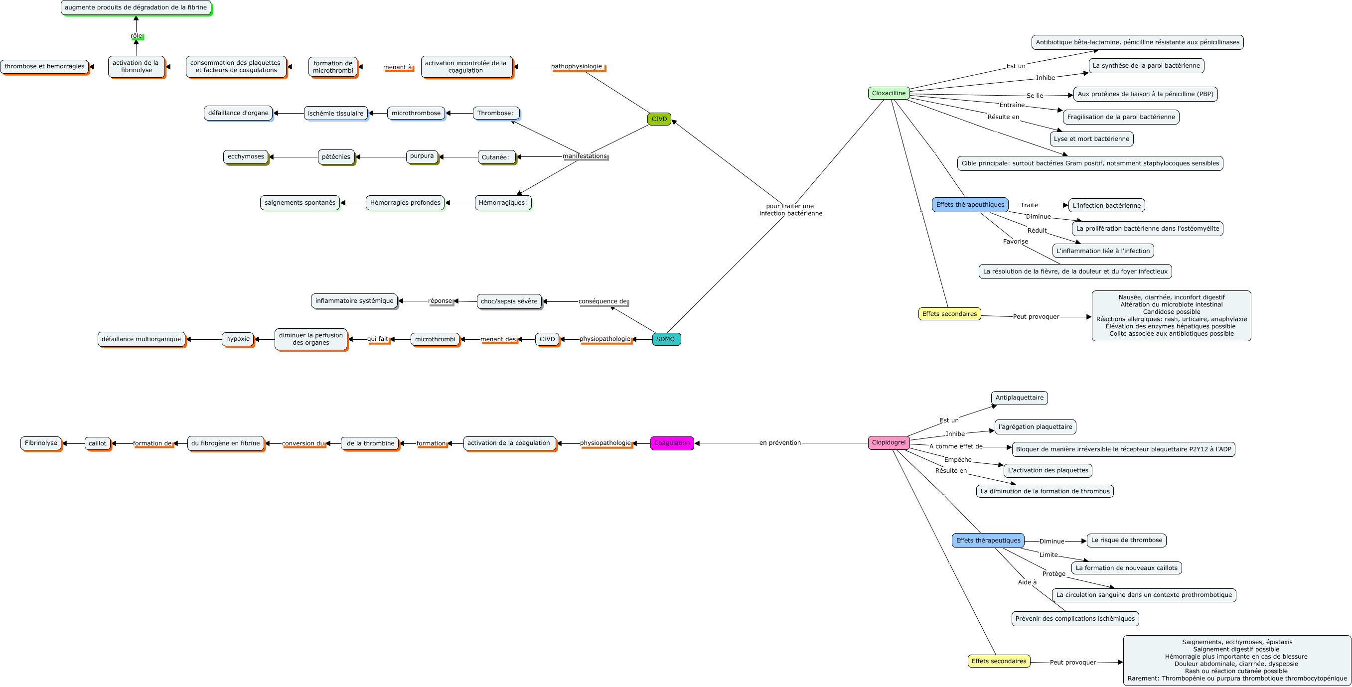 This Concept Map, created with IHMC CmapTools, has information related to: Cas 7, activation de la fibrinolyse rôle augmente produits de dégradation de la fibrine, Effets thérapeutiques Diminue Le risque de thrombose, Effets thérapeuthiques Diminue La prolifération bactérienne dans l'ostéomyélite, de la thrombine conversion du du fibrogène en fibrine, Effets thérapeuthiques Réduit L'inflammation liée à l'infection, Clopidogrel Empêche L'activation des plaquettes, Cloxacilline pour traiter une infection bactérienne CIVD, Effets secondaires Peut provoquer Nausée, diarrhée, inconfort digestif Altération du microbiote intestinal Candidose possible Réactions allergiques: rash, urticaire, anaphylaxie Élévation des enzymes hépatiques possible Colite associée aux antibiotiques possible, activation incontrolée de la coagulation menant à formation de microthrombi, Effets secondaires Peut provoquer Saignements, ecchymoses, épistaxis Saignement digestif possible Hémorragie plus importante en cas de blessure Douleur abdominale, diarrhée, dyspepsie Rash ou réaction cutanée possible Rarement: Thrombopénie ou purpura thrombotique thrombocytopénique, Clopidogrel A comme effet de Bloquer de manière irréversible le récepteur plaquettaire P2Y12 à l'ADP, SDMO physiopathologie CIVD, Effets thérapeutiques Protège La circulation sanguine dans un contexte prothrombotique, hypoxie défaillance multiorganique, choc/sepsis sévère réponse inflammatoire systémique, ischémie tissulaire défaillance d'organe, Clopidogrel Inhibe l'agrégation plaquettaire, CIVD manifestations Thrombose:, diminuer la perfusion des organes hypoxie, Cloxacilline pour traiter une infection bactérienne SDMO