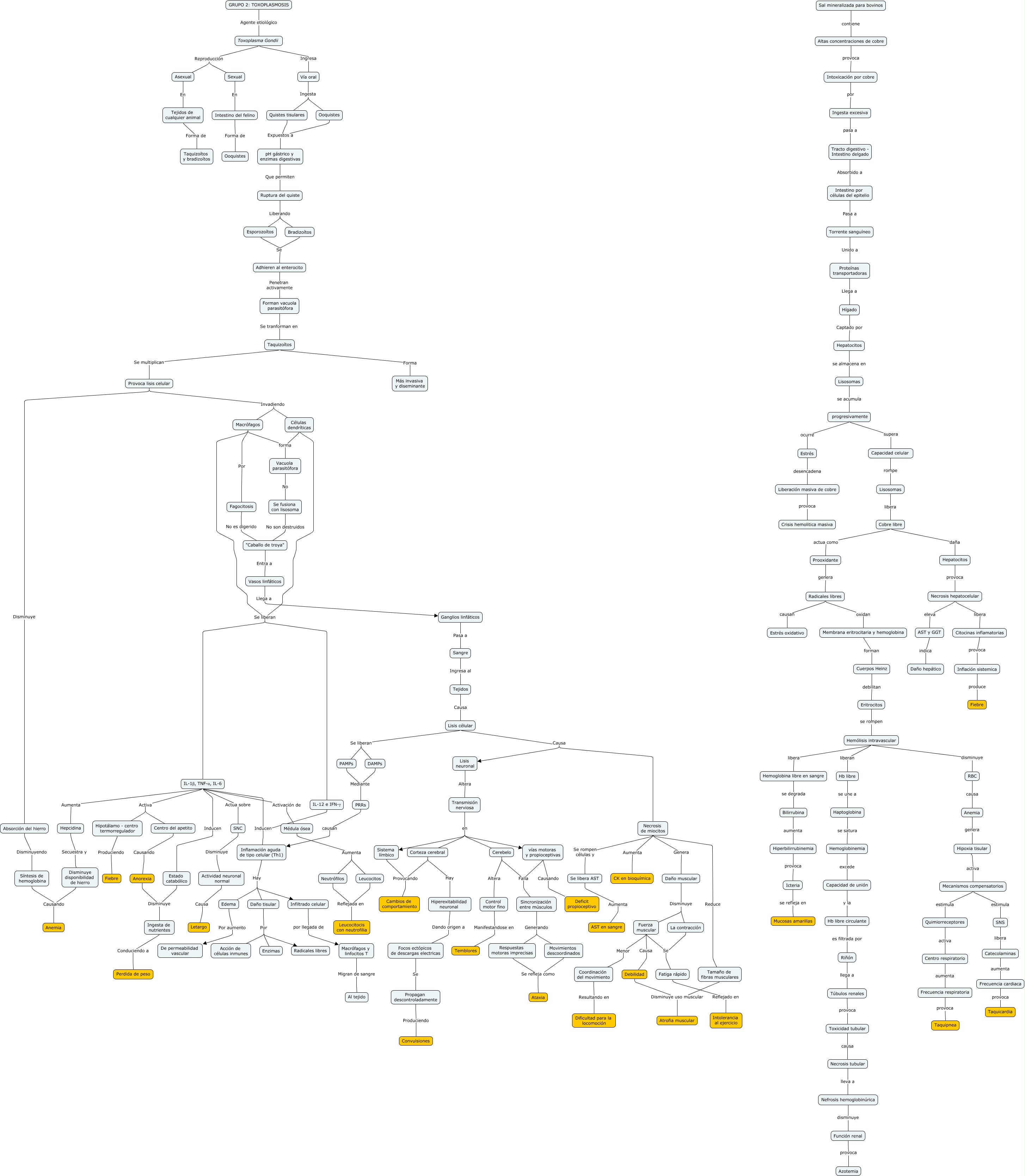 Este Cmap, tiene información relacionada con: Fisios corte 3.1, Taquizoítos Se multiplican Provoca lisis celular, Edema Por aumento De permeabilidad vascular, Se libera AST Aumenta AST en sangre, Macrófagos forma Vacuola parasitófora, Tejidos de cualquier animal Forma de Taquizoítos y bradizoítos, IL-1β, TNF-α, IL-6 Aumenta Hepcidina, Fagocitosis No es digerido "Caballo de troya", IL-1β, TNF-α, IL-6 Activa Centro del apetito, Sal mineralizada para bovinos contiene Altas concentraciones de cobre, Daño muscular Disminuye La contracción, Hiperbilirrubinemia provoca Icteria, Necrosis hepatocelular libera Citocinas inflamatorias, Actividad neuronal normal Causa Letargo, Daño tisular Por Enzimas, Macrófagos Se liberan IL-12 e IFN-γ, Hb libre circulante es filtrada por Riñón, Centro del apetito Causando Anorexia, Síntesis de hemoglobina Causando Anemia, PRRs causan Inflamación aguda de tipo celular (Th1), Sexual En Intestino del felino