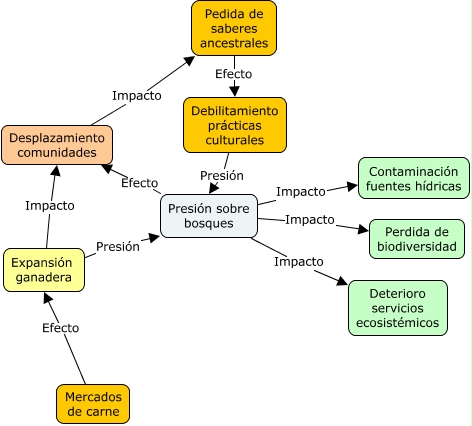 Este Cmap, tiene información relacionada con: Deforestación, Mercados de carne Efecto Expansión ganadera, Presión sobre bosques Impacto Contaminación fuentes hídricas, Debilitamiento prácticas culturales Presión Presión sobre bosques, Expansión ganadera Impacto Desplazamiento comunidades, Presión sobre bosques Impacto Perdida de biodiversidad, Presión sobre bosques Efecto Desplazamiento comunidades, Presión sobre bosques Impacto Deterioro servicios ecosistémicos, Desplazamiento comunidades Impacto Pedida de saberes ancestrales, Expansión ganadera Presión Presión sobre bosques, Pedida de saberes ancestrales Efecto Debilitamiento prácticas culturales