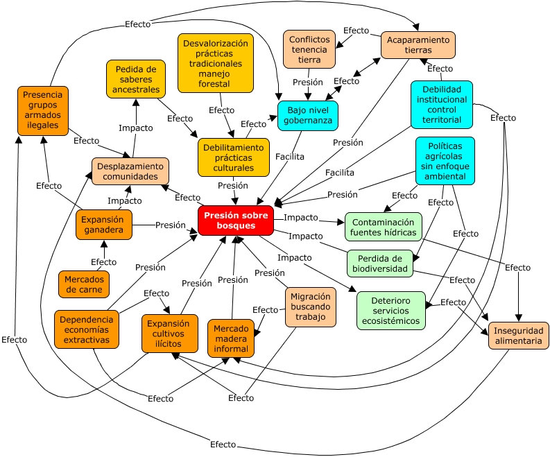 Este Cmap, tiene información relacionada con: Deforestación Putumayo, Conflictos tenencia tierra Presión Bajo nivel gobernanza, Expansión cultivos ilícitos Efecto Presencia grupos armados ilegales, Contaminación fuentes hídricas Efecto Inseguridad alimentaria, Migración buscando trabajo Efecto Mercado madera informal, Políticas agrícolas sin enfoque ambiental Efecto Deterioro servicios ecosistémicos, Presión sobre bosques Efecto Desplazamiento comunidades, Expansión ganadera Presión Presión sobre bosques, Dependencia economías extractivas Presión Presión sobre bosques, Políticas agrícolas sin enfoque ambiental Efecto Perdida de biodiversidad, Dependencia economías extractivas Efecto Expansión cultivos ilícitos, Expansión ganadera Impacto Desplazamiento comunidades, Desvalorización prácticas tradicionales manejo forestal Efecto Debilitamiento prácticas culturales, Debilitamiento prácticas culturales Efecto Bajo nivel gobernanza, Debilitamiento prácticas culturales Presión Presión sobre bosques, Bajo nivel gobernanza Efecto Acaparamiento tierras, Inseguridad alimentaria Efecto Desplazamiento comunidades, Mercados de carne Efecto Expansión ganadera, Bajo nivel gobernanza Facilita Presión sobre bosques, Expansión ganadera Efecto Presencia grupos armados ilegales, Presencia grupos armados ilegales Efecto Acaparamiento tierras