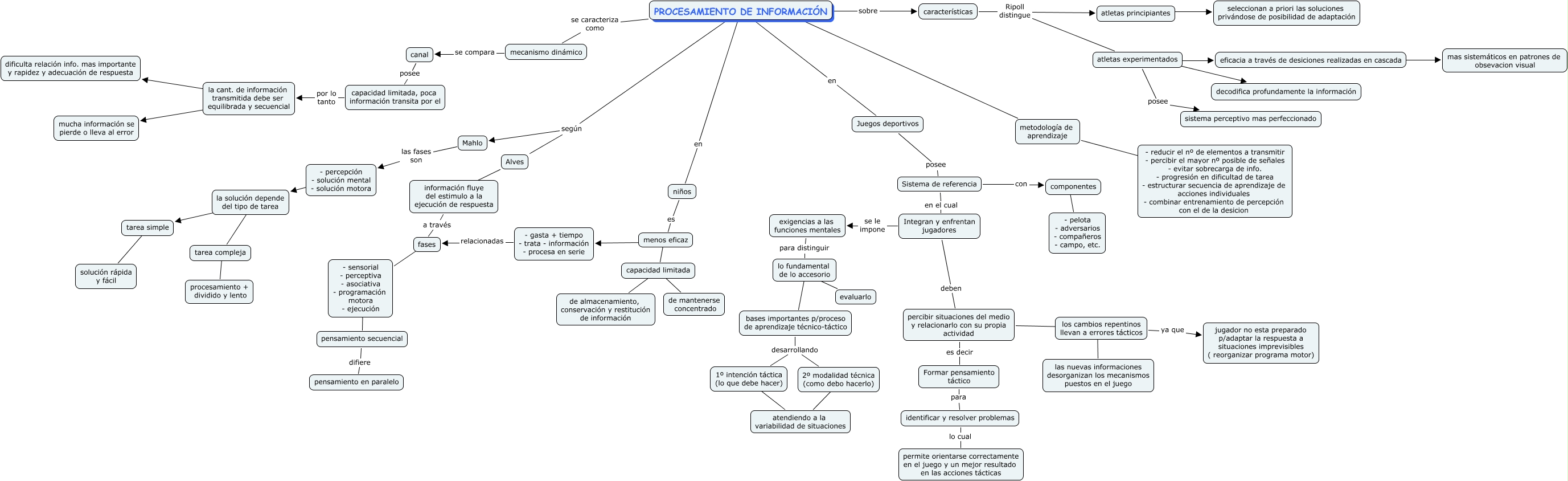 Este Cmap, tiene información relacionada con: Tavares (Argañaraz, Martinez, Hahn), 2º modalidad técnica (como debo hacerlo) ???? atendiendo a la variabilidad de situaciones, - gasta + tiempo - trata - información - procesa en serie relacionadas fases, percibir situaciones del medio y relacionarlo con su propia actividad ???? los cambios repentinos llevan a errores tácticos, mecanismo dinámico se compara canal, 1º intención táctica (lo que debe hacer) ???? atendiendo a la variabilidad de situaciones, fases ???? - sensorial - perceptiva - asociativa - programación motora - ejecución, PROCESAMIENTO DE INFORMACIÓN se caracteriza como mecanismo dinámico, capacidad limitada, poca información transita por el por lo tanto la cant. de información transmitida debe ser equilibrada y secuencial, PROCESAMIENTO DE INFORMACIÓN ???? metodología de aprendizaje, Sistema de referencia en el cual Integran y enfrentan jugadores, la cant. de información transmitida debe ser equilibrada y secuencial ???? mucha información se pierde o lleva al error, Sistema de referencia con componentes, percibir situaciones del medio y relacionarlo con su propia actividad es decir Formar pensamiento táctico, lo fundamental de lo accesorio ???? bases importantes p/proceso de aprendizaje técnico-táctico, identificar y resolver problemas lo cual permite orientarse correctamente en el juego y un mejor resultado en las acciones tácticas, atletas experimentados ???? eficacia a través de desiciones realizadas en cascada, características Ripoll distingue atletas principiantes, la solución depende del tipo de tarea ???? tarea simple, Juegos deportivos posee Sistema de referencia, bases importantes p/proceso de aprendizaje técnico-táctico desarrollando 2º modalidad técnica (como debo hacerlo)
