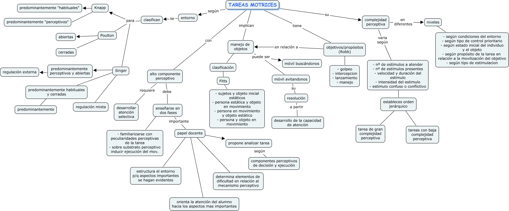 Este Cmap, tiene información relacionada con: Sanchez Bañuelo (Argañaraz, Martinez, Hahn), papel docente ???? orienta la atención del alumno hacia los aspectos mas importantes, Singer ???? regulación mixta, resolución a partir desarrollo de la capacidad de atención, objetivos/propósitos (Robb) en relación a manejo de objetos, TAREAS MOTRICES implican manejo de objetos, clasifican para Singer, Knapp ???? predominantemente "perceptivos", manejo de objetos puede ser móvil buscándonos, manejo de objetos puede ser móvil avitandonos, enseñarse en dos fases importante papel docente, papel docente ???? propone analizar tarea, papel docente ???? determina elementos de dificultad en relación al mecanismo perceptivo, - nº de estímulos a atender - nº de estímulos presentes - velocidad y duración del estimulo - intensidad del estimulo - estimulo confuso o conflictivo ???? estableces orden jerárquico, complejidad perceptiva en diferentes niveles, complejidad perceptiva varia según - nº de estímulos a atender - nº de estímulos presentes - velocidad y duración del estimulo - intensidad del estimulo - estimulo confuso o conflictivo, clasifican para Knapp, TAREAS MOTRICES con alto componente perceptivo, predominantemente habituales y cerradas ???? predominantemente, Singer ???? predominantemente habituales y cerradas, Knapp ???? predominantemente "habituales"