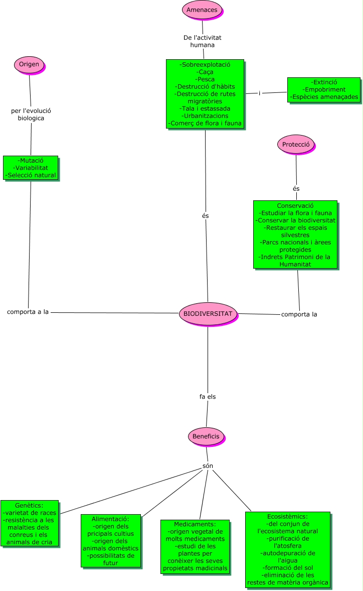 Este Cmap, tiene información relacionada con: La biodiversitat, Beneficis són Medicaments: -origen vegetal de molts medicaments -estudi de les plantes per conèixer les seves propietats madicinals, Beneficis són Genètics: -varietat de races -resistència a les malalties dels conreus i els animals de cria, Beneficis són Ecosistèmics: -del conjun de l'ecosistema natural -purificació de l'atosfera -autodepuració de l'aigua -formació del sol -eliminació de les restes de matèria orgànica, -Mutació -Variabilitat -Selecció natural comporta a la BIODIVERSITAT, Protecció és Conservació -Estudiar la flora i fauna -Conservar la biodiversitat -Restaurar els espais silvestres -Parcs nacionals i àrees protegides -Indrets Patrimoni de la Humanitat, Origen per l'evolució biologica -Mutació -Variabilitat -Selecció natural, Amenaces De l'activitat humana -Sobreexplotació -Caça -Pesca -Destrucció d'hàbits -Destrucció de rutes migratòries -Tala i estassada -Urbanitzacions -Comerç de flora i fauna, Conservació -Estudiar la flora i fauna -Conservar la biodiversitat -Restaurar els espais silvestres -Parcs nacionals i àrees protegides -Indrets Patrimoni de la Humanitat comporta la BIODIVERSITAT, -Sobreexplotació -Caça -Pesca -Destrucció d'hàbits -Destrucció de rutes migratòries -Tala i estassada -Urbanitzacions -Comerç de flora i fauna i -Extinció -Empobriment -Espècies amenaçades, Beneficis són Alimentació: -origen dels pricipals cultius -origen dels animals domèstics -possibilitats de futur, BIODIVERSITAT fa els Beneficis, -Sobreexplotació -Caça -Pesca -Destrucció d'hàbits -Destrucció de rutes migratòries -Tala i estassada -Urbanitzacions -Comerç de flora i fauna és BIODIVERSITAT