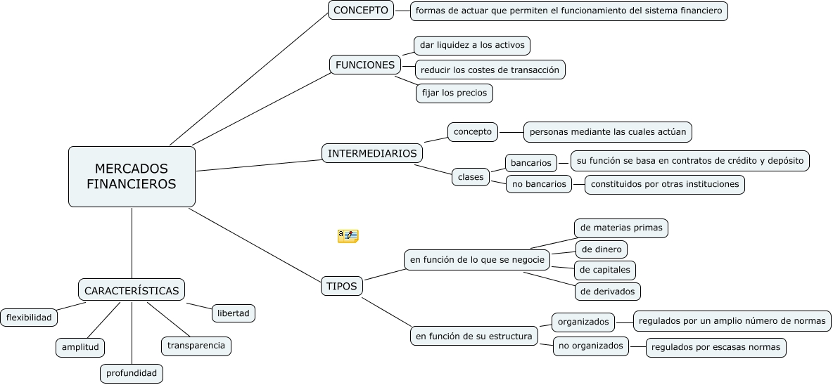 mercados financieros, bancarios ???? su función se basa en contratos de crédito y depósito, FUNCIONES ???? fijar los precios, TIPOS ???? en función de su estructura, CARACTERÍSTICAS ???? flexibilidad, CARACTERÍSTICAS ???? libertad, en función de lo que se negocie ???? de derivados, en función de su estructura ???? organizados, CARACTERÍSTICAS ???? transparencia, MERCADOS FINANCIEROS ???? FUNCIONES, en función de lo que se negocie ???? de materias primas