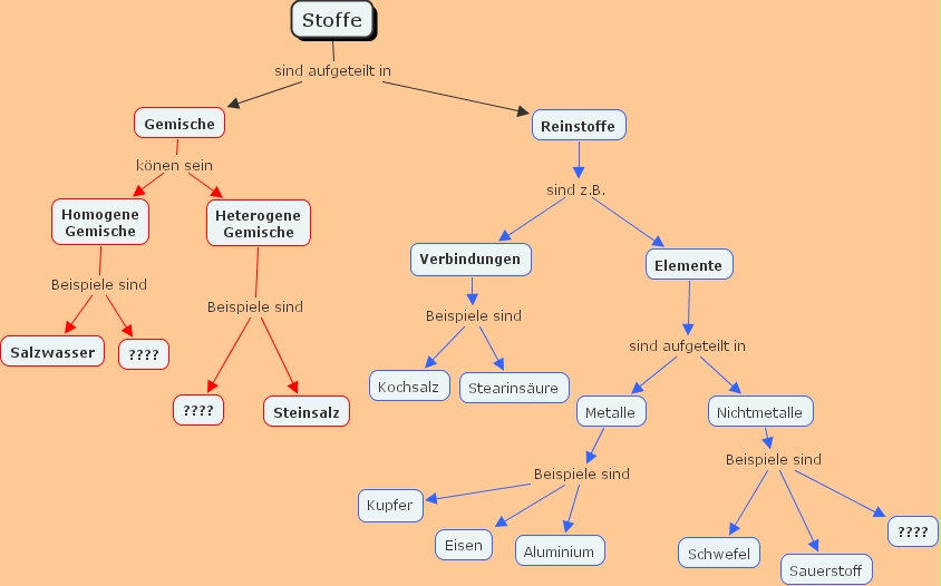 Verbindungen Beispiele sind Stearins�ure, Verbindungen Beispiele sind Kochsalz, Homogene Gemische Beispiele sind Salzwasser, Homogene Gemische Beispiele sind ????, Stoffe sind aufgeteilt in Gemische, Stoffe sind aufgeteilt in Reinstoffe, Gemische k�nen sein Heterogene Gemische, Gemische k�nen sein Homogene Gemische, Nichtmetalle Beispiele sind Sauerstoff, Nichtmetalle Beispiele sind ????, Nichtmetalle Beispiele sind Schwefel, Reinstoffe sind z.B. Verbindungen, Reinstoffe sind z.B. Elemente, Metalle Beispiele sind Eisen, Metalle Beispiele sind Aluminium, Metalle Beispiele sind Kupfer, Heterogene Gemische Beispiele sind ????, Heterogene Gemische Beispiele sind Steinsalz, Elemente sind aufgeteilt in Nichtmetalle, Elemente sind aufgeteilt in Metalle
