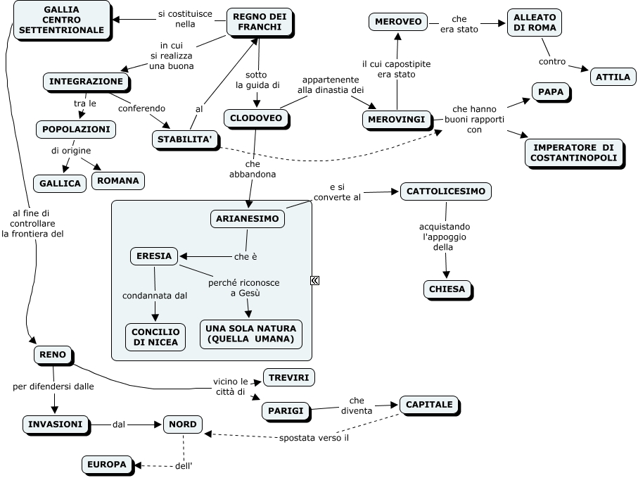 REGNO DEI FRANCHI, ERESIA perché riconosce a Gesù UNA SOLA NATURA (QUELLA UMANA), ARIANESIMO e si converte al CATTOLICESIMO, MEROVINGI che hanno buoni rapporti con PAPA, STABILITA' al REGNO DEI FRANCHI, CLODOVEO che abbandona ARIANESIMO, RENO vicino le città di TREVIRI, MEROVINGI che hanno buoni rapporti con IMPERATORE DI COSTANTINOPOLI, REGNO DEI FRANCHI si costituisce nella GALLIA CENTRO SETTENTRIONALE, REGNO DEI FRANCHI sotto la guida di CLODOVEO, INVASIONI dal NORD