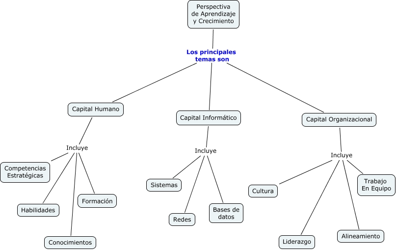 Perspectiva de Aprendizaje y Crecimiento, Capital Organizacional Incluye Trabajo En Equipo, Capital Informático Incluye Sistemas, Capital Informático Incluye Bases de datos, Capital Humano Incluye Conocimientos, Capital Humano Incluye Formación, Capital Humano Incluye Competencias Estratégicas, Capital Organizacional Incluye Alineamiento, Capital Humano Incluye Habilidades, Capital Organizacional Incluye Liderazgo, Capital Informático Incluye Redes