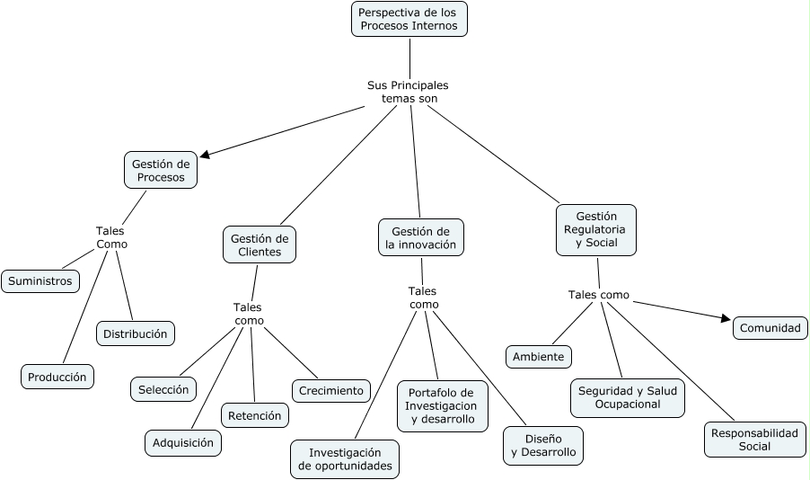 Perspectiva de los procesos internos, Gestión de Clientes Tales como Selección, Gestión de Clientes Tales como Adquisición, Perspectiva de los Procesos Internos Sus Principales temas son Gestión Regulatoria y Social, Perspectiva de los Procesos Internos Sus Principales temas son Gestión de la innovación, Gestión de la innovación Tales como Portafolo de Investigacion y desarrollo, Gestión de Clientes Tales como Retención, Gestión Regulatoria y Social Tales como Responsabilidad Social, Gestión de la innovación Tales como Diseño y Desarrollo, Gestión Regulatoria y Social Tales como Comunidad, Perspectiva de los Procesos Internos Sus Principales temas son Gestión de Procesos
