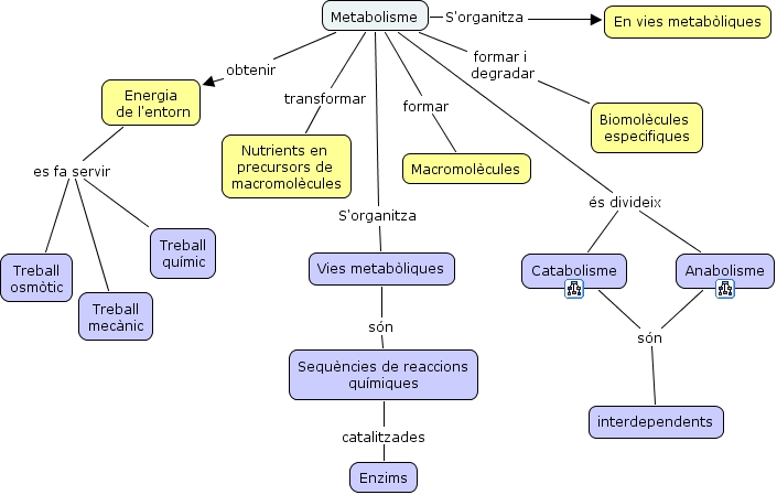 Metabolisme, Anabolisme són interdependents, Catabolisme són interdependents, Metabolisme S'organitza Vies metabòliques, Metabolisme transformar Nutrients en precursors de macromolècules, Metabolisme és divideix Catabolisme, Energia de l'entorn es fa servir Treball químic, Energia de l'entorn es fa servir Treball osmòtic, Vies metabòliques són Sequències de reaccions químiques, Sequències de reaccions químiques catalitzades Enzims, Metabolisme és divideix Anabolisme