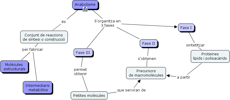 Anabolisme, Proteines lípids i polisacàrids a partir Precursors de macromolècules, Conjunt de reaccions de síntesi o construcció per fabricar Molècules estructurals, Anabolisme S'organitza en 3 fases Fase III, Anabolisme S'organitza en 3 fases Fase II, Conjunt de reaccions de síntesi o construcció per fabricar Intermediaris metabòlics, Anabolisme S'organitza en 3 fases Fase I, Fase I sintetitzar Proteines lípids i polisacàrids, Anabolisme és Conjunt de reaccions de síntesi o construcció, Fase III permet obtenir Petites molècules, Petites molècules que serviran de Precursors de macromolècules
