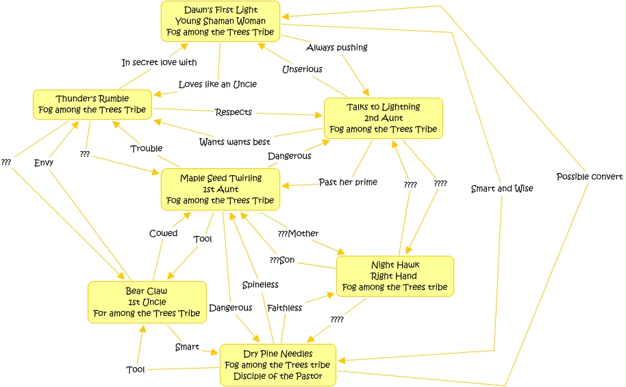 FogAmongTheTrees, Dry Pine Needles Fog among the Trees tribe Disciple of the Pastor Possible convert Dawn's First Light Young Shaman Woman Fog among the Trees Tribe, Bear Claw 1st Uncle For among the Trees Tribe Envy Thunder's Rumble Fog among the Trees Tribe, Maple Seed Twirling 1st Aunt Fog among the Trees Tribe Dangerous Talks to Lightning 2nd Aunt Fog among the Trees Tribe, Dawn's First Light Young Shaman Woman Fog among the Trees Tribe Always pushing Talks to Lightning 2nd Aunt Fog among the Trees Tribe, Talks to Lightning 2nd Aunt Fog among the Trees Tribe Wants wants best Thunder's Rumble Fog among the Trees Tribe, Maple Seed Twirling 1st Aunt Fog among the Trees Tribe Trouble Thunder's Rumble Fog among the Trees Tribe, Bear Claw 1st Uncle For among the Trees Tribe Smart Dry Pine Needles Fog among the Trees tribe Disciple of the Pastor, Night Hawk Right Hand Fog among the Trees tribe ???Son Maple Seed Twirling 1st Aunt Fog among the Trees Tribe, Maple Seed Twirling 1st Aunt Fog among the Trees Tribe Tool Bear Claw 1st Uncle For among the Trees Tribe, Night Hawk Right Hand Fog among the Trees tribe ???? Talks to Lightning 2nd Aunt Fog among the Trees Tribe