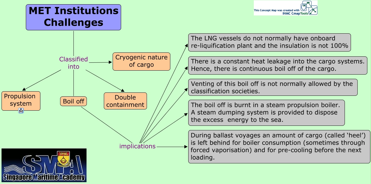 Challenges to MET Institutions (03), Boil off implications During ballast voyages an amount of cargo (called ‘heel’) is left behind for boiler consumption (sometimes through forced vaporisation) and for pre-cooling before the next loading., Boil off implications The LNG vessels do not normally have onboard re-liquification plant and the insulation is not 100%, MET Institutions Challenges Classified into Cryogenic nature of cargo, MET Institutions Challenges Classified into Boil off, MET Institutions Challenges Classified into Double containment, Boil off implications Venting of this boil off is not normally allowed by the classification societies., Boil off implications There is a constant heat leakage into the cargo systems. Hence, there is continuous boil off of the cargo., MET Institutions Challenges Classified into Propulsion system, Boil off implications The boil off is burnt in a steam propulsion boiler. A steam dumping system is provided to dispose the excess energy to the sea.