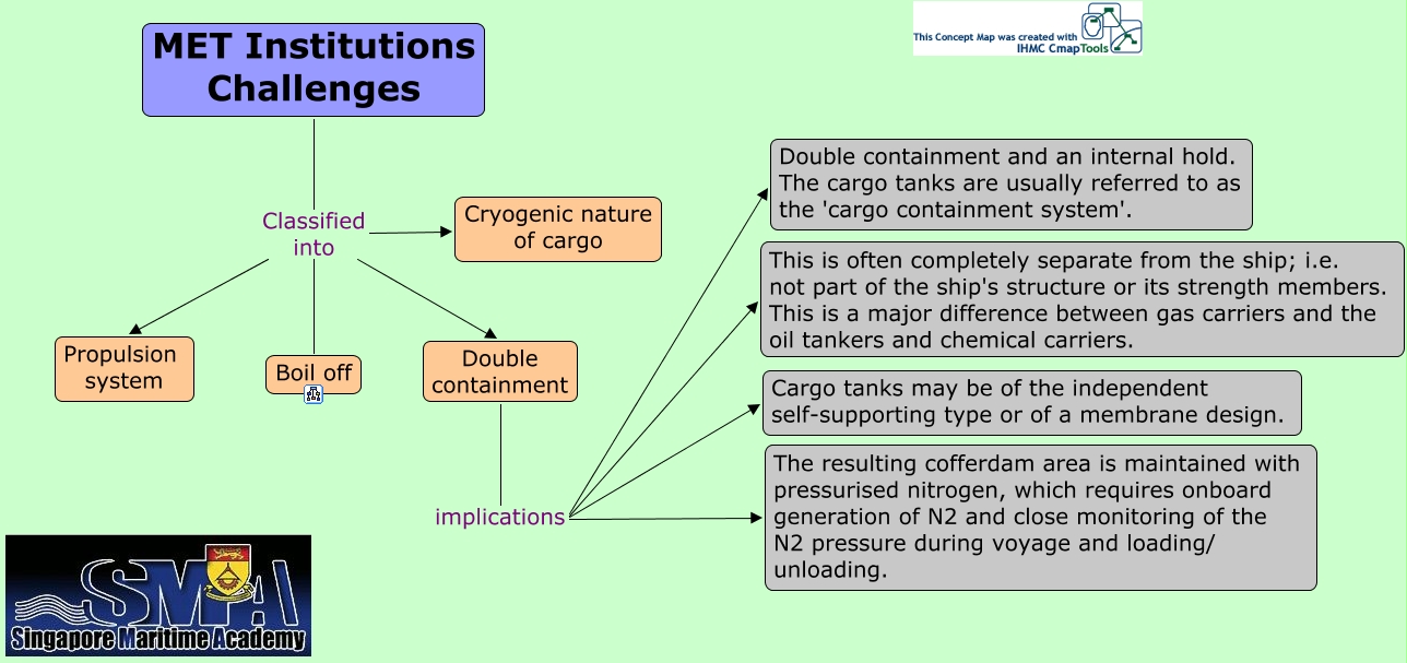 Challenges to MET Institutions (02), Double containment implications The resulting cofferdam area is maintained with pressurised nitrogen, which requires onboard generation of N2 and close monitoring of the N2 pressure during voyage and loading/ unloading., MET Institutions Challenges Classified into Double containment, MET Institutions Challenges Classified into Boil off, MET Institutions Challenges Classified into Cryogenic nature of cargo, Double containment implications Double containment and an internal hold. The cargo tanks are usually referred to as the 'cargo containment system'., Double containment implications This is often completely separate from the ship; i.e. not part of the ship's structure or its strength members. This is a major difference between gas carriers and the oil tankers and chemical carriers., Double containment implications Cargo tanks may be of the independent self-supporting type or of a membrane design., MET Institutions Challenges Classified into Propulsion system