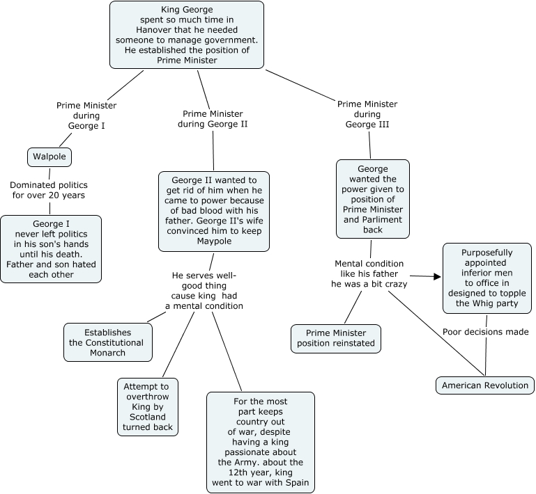 1st Prime Minister - Walpole, George II wanted to get rid of him when he came to power because of bad blood with his father. George II's wife convinced him to keep Maypole He serves well- good thing cause king had a mental condition For the most part keeps country out of war, despite having a king passionate about the Army. about the 12th year, king went to war with Spain, George wanted the power given to position of Prime Minister and Parliment back Mental condition like his father he was a bit crazy American Revolution, King George spent so much time in Hanover that he needed someone to manage government. He established the position of Prime Minister Prime Minister during George I Walpole, George II wanted to get rid of him when he came to power because of bad blood with his father. George II's wife convinced him to keep Maypole He serves well- good thing cause king had a mental condition Attempt to overthrow King by Scotland turned back, Purposefully appointed inferior men to office in designed to topple the Whig party Poor decisions made American Revolution, King George spent so much time in Hanover that he needed someone to manage government. He established the position of Prime Minister Prime Minister during George II George II wanted to get rid of him when he came to power because of bad blood with his father. George II's wife convinced him to keep Maypole, George II wanted to get rid of him when he came to power because of bad blood with his father. George II's wife convinced him to keep Maypole He serves well- good thing cause king had a mental condition Establishes the Constitutional Monarch, George wanted the power given to position of Prime Minister and Parliment back Mental condition like his father he was a bit crazy Purposefully appointed inferior men to office in designed to topple the Whig party, Walpole Dominated politics for over 20 years George I never left politics in his son's hands until his death. Father and son hated each other, George wanted the power given to position of Prime Minister and Parliment back Mental condition like his father he was a bit crazy Prime Minister position reinstated