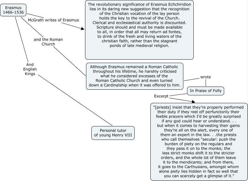 Erasmus, In Praise of Folly Excerpt "[priests] insist that they’re properly performed their duty if they reel off perfunctorily their feeble prayers which I’d be greatly surprised if any god could hear or understand. . . but when it comes to harvesting their gains they’re all on the alert, every one of them an expert in the law. . .the priests who call themselves "secular: push the burden of piety on the regulars and they pass it on to the monks; the less strict monks shift it to the stricter orders, and the whole lot of them leave it to the mendicants; and from there, it goes to the Carthusians, amongst whom alone piety lies hidden in fact so well that you can scarcely get a glimpse of it.", Erasmus 1466-1536 McGrath writes of Erasmus The revolutionary significance of Erasmus Echchiridion lies in its daring new suggestion that the recognition of the Christian vocation of the lay person holds the key to the revival of the Church. Clerical and ecclesiastical authority is discounted. Scripture should and must be made available to all, in order that all may return ad fontes, to drink of the fresh and living waters of the christian faith, rather than the stagnant ponds of late medieval religion., Erasmus 1466-1536 And English Kings Personal tutor of young Henry VIII, Erasmus 1466-1536 and the Roman Church Although Erasmus remained a Roman Catholic throughout his lifetime, he harshly criticised what he considered excesses of the Roman Catholic Church and even turned down a Cardinalship when it was offered to him., Although Erasmus remained a Roman Catholic throughout his lifetime, he harshly criticised what he considered excesses of the Roman Catholic Church and even turned down a Cardinalship when it was offered to him. wrote In Praise of Folly