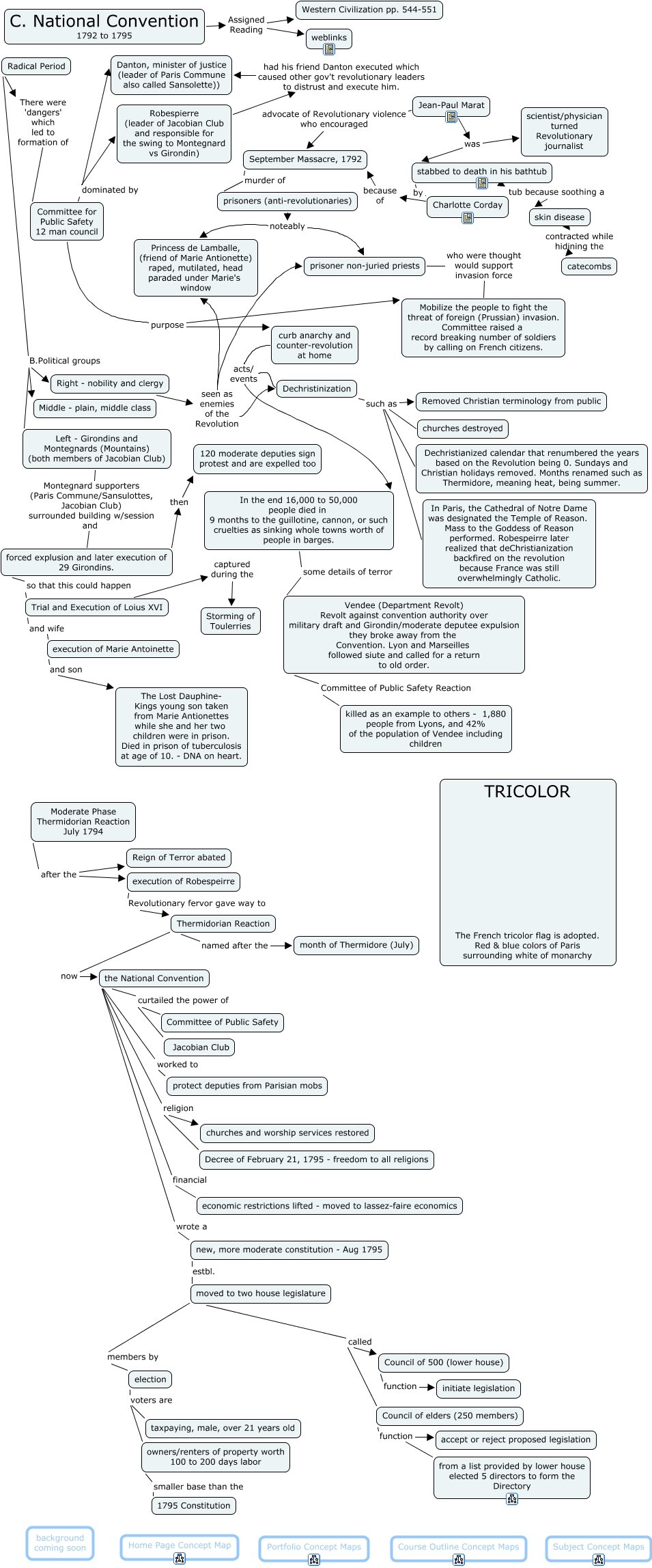 04 FR Stages of Government - National Convention, election voters are taxpaying, male, over 21 years old, moved to two house legislature called Council of elders (250 members), moved to two house legislature called Council of 500 (lower house), Jean-Paul Marat was scientist/physician turned Revolutionary journalist, Trial and Execution of Loius XVI and wife execution of Marie Antoinette, new, more moderate constitution - Aug 1795 estbl. moved to two house legislature, Committee for Public Safety 12 man council dominated by Robespierre (leader of Jacobian Club and responsible for the swing to Montegnard vs Girondin), Dechristinization such as Dechristianized calendar that renumbered the years based on the Revolution being 0. Sundays and Christian holidays removed. Months renamed such as Thermidore, meaning heat, being summer., execution of Marie Antoinette and son The Lost Dauphine- Kings young son taken from Marie Antionettes while she and her two children were in prison. Died in prison of tuberculosis at age of 10. - DNA on heart., the National Convention worked to protect deputies from Parisian mobs