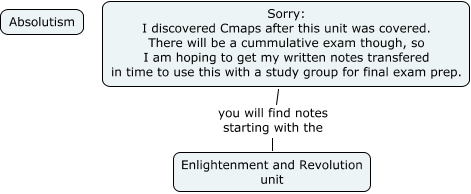 This Concept Map has information related to: Absolutism, Sorry: I discovered Cmaps after this unit was covered. There will be a cummulative exam though, so I am hoping to get my written notes transfered in time to use this with a study group for final exam prep. you will find notes starting with the Enlightenment and Revolution unit