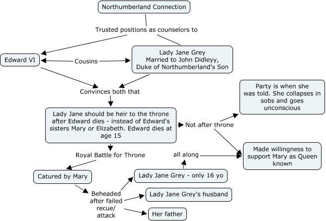 Lady Jane Grey, Catured by Mary Beheaded after failed recue/ attack Lady Jane Grey's husband, Catured by Mary Beheaded after failed recue/ attack Her father, Northumberland Connection Trusted positions as counselors to Edward VI, Lady Jane should be heir to the throne after Edward dies - instead of Edward's sisters Mary or Elizabeth. Edward dies at age 15 Not after throne Party is when she was told. She collapses in sobs and goes unconscious, Northumberland Connection Trusted positions as counselors to Lady Jane Grey Married to John Didleyy, Duke of Northumberland's Son, Lady Jane should be heir to the throne after Edward dies - instead of Edward's sisters Mary or Elizabeth. Edward dies at age 15 Not after throne Made willingness to support Mary as Queen known, Edward VI Convinces both that Lady Jane should be heir to the throne after Edward dies - instead of Edward's sisters Mary or Elizabeth. Edward dies at age 15, Lady Jane should be heir to the throne after Edward dies - instead of Edward's sisters Mary or Elizabeth. Edward dies at age 15 Royal Battle for Throne Catured by Mary, Lady Jane Grey - only 16 yo all along Made willingness to support Mary as Queen known, Lady Jane Grey Married to John Didleyy, Duke of Northumberland's Son Convinces both that Lady Jane should be heir to the throne after Edward dies - instead of Edward's sisters Mary or Elizabeth. Edward dies at age 15