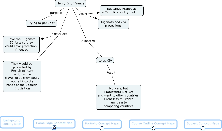 Edict of Nantes, Loius XIV Result No wars, but Protestants just left and went to other countries. Great loss to France and gain to competing countries, Henry IV of France effect Hugenots had civil protections, Henry IV of France effect Sustained France as a Catholic country, but . . ., Henry IV of France Revocated Loius XIV, Henry IV of France particulars Gave the Hugenots 50 forts so they could have protection if needed, Henry IV of France particulars They would be protected by French military action while traveling so they would not fall into the hands of the Spanish Inquisition, Henry IV of France purpose Trying to get unity