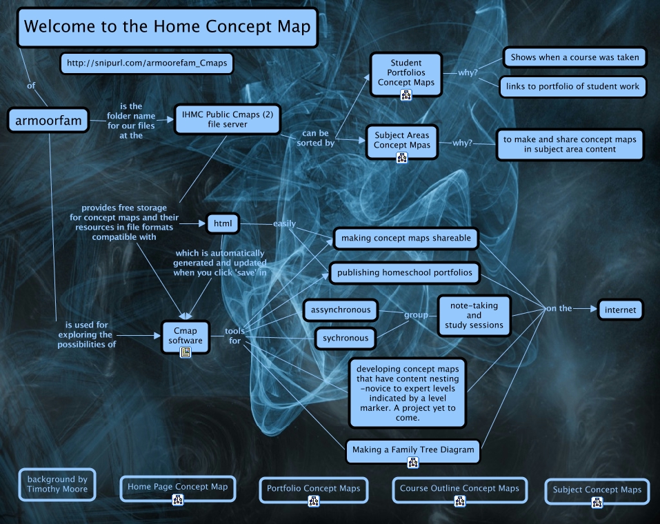 This Concept Map, created with IHMC CmapTools, has information related to: armoorefam Home Cmap, IHMC Public Cmaps (2) file server provides free storage for concept maps and their resources in file formats compatible with html, IHMC Public Cmaps (2) file server provides free storage for concept maps and their resources in file formats compatible with Cmap software, note-taking and study sessions on the internet, armoorfam is the folder name for our files at the IHMC Public Cmaps (2) file server, Student Portfolios Concept Maps why? links to portfolio of student work, assynchronous group note-taking and study sessions, Cmap software tools for assynchronous, html easily publishing homeschool portfolios, html easily making concept maps shareable, Cmap software tools for publishing homeschool portfolios, IHMC Public Cmaps (2) file server can be sorted by Subject Areas Concept Mpas, Cmap software tools for sychronous, making concept maps shareable on the internet, publishing homeschool portfolios on the internet, armoorfam is used for exploring the possibilities of Cmap software, Subject Areas Concept Mpas why? to make and share concept maps in subject area content, developing concept maps that have content nesting -novice to expert levels indicated by a level marker. A project yet to come. on the internet, Cmap software tools for making concept maps shareable, Student Portfolios Concept Maps why? Shows when a course was taken, Cmap software tools for Making a Family Tree Diagram