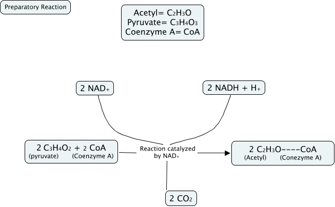 Preparatory Reaction, 2 NAD+ Reaction catalyzed by NAD+ 2 CO2, 2 C3H4O2 + 2 CoA (pyruvate) (Coenzyme A) Reaction catalyzed by NAD+ 2 CO2, 2 NADH + H+ Reaction catalyzed by NAD+ 2 C2H3O----CoA (Acetyl) (Conezyme A), 2 NAD+ Reaction catalyzed by NAD+ 2 C2H3O----CoA (Acetyl) (Conezyme A), 2 NADH + H+ Reaction catalyzed by NAD+ 2 CO2, 2 C3H4O2 + 2 CoA (pyruvate) (Coenzyme A) Reaction catalyzed by NAD+ 2 C2H3O----CoA (Acetyl) (Conezyme A)