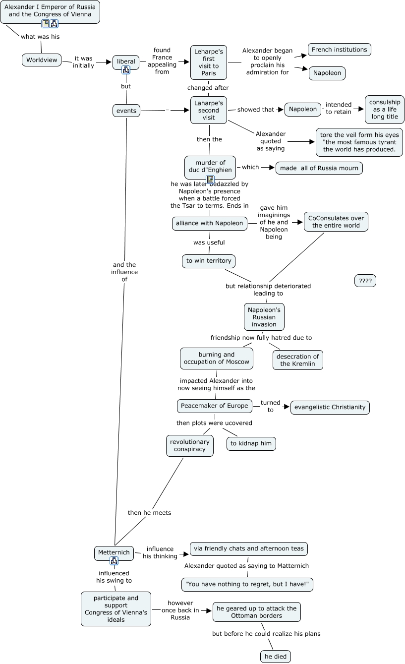 Alexander I Emperor of Russia, murder of duc d"Enghien which made all of Russia mourn, alliance with Napoleon was useful to win territory, Peacemaker of Europe then plots were ucovered to kidnap him, Napoleon's Russian invasion friendship now fully hatred due to burning and occupation of Moscow, CoConsulates over the entire world but relationship deteriorated leading to Napoleon's Russian invasion, Napoleon's Russian invasion friendship now fully hatred due to desecration of the Kremlin, Laharpe's second visit showed that Napoleon, Leharpe's first visit to Paris changed after Laharpe's second visit, events and the influence of Metternich, to win territory but relationship deteriorated leading to Napoleon's Russian invasion