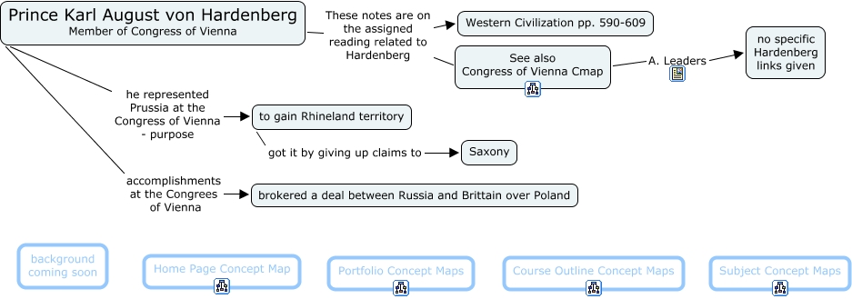 Prince Karl August von Hardenberg of Prussia, to gain Rhineland territory got it by giving up claims to Saxony, See also Congress of Vienna Cmap A. Leaders no specific Hardenberg links given, Prince Karl August von Hardenberg Member of Congress of Vienna These notes are on the assigned reading related to Hardenberg See also Congress of Vienna Cmap, Prince Karl August von Hardenberg Member of Congress of Vienna accomplishments at the Congrees of Vienna brokered a deal between Russia and Brittain over Poland, Prince Karl August von Hardenberg Member of Congress of Vienna he represented Prussia at the Congress of Vienna - purpose to gain Rhineland territory, Prince Karl August von Hardenberg Member of Congress of Vienna These notes are on the assigned reading related to Hardenberg Western Civilization pp. 590-609