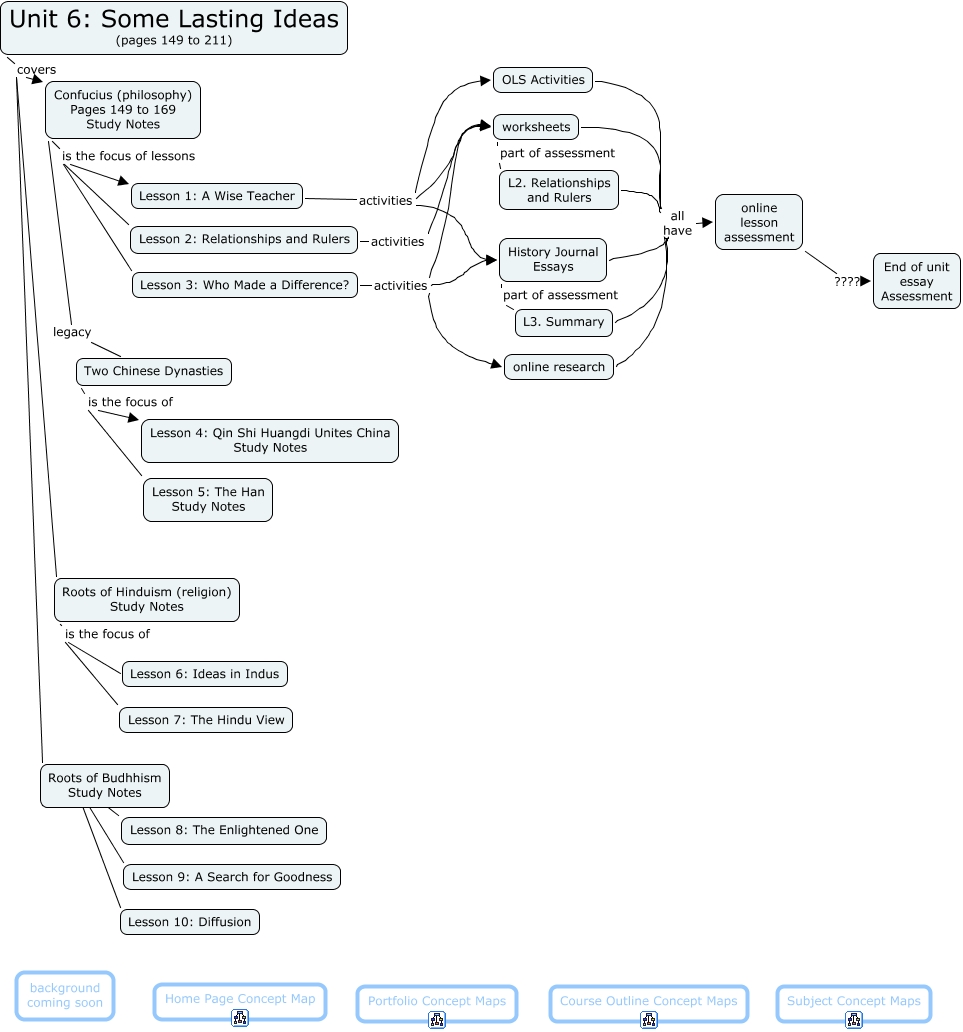 Unit 06 Some Lasting Ideas, OLS Activities all have online lesson assessment, Unit 6: Some Lasting Ideas (pages 149 to 211) covers Roots of Budhhism Study Notes, Roots of Hinduism (religion) Study Notes is the focus of Lesson 6: Ideas in Indus, History Journal Essays part of assessment L3. Summary, Two Chinese Dynasties is the focus of Lesson 5: The Han Study Notes, Lesson 2: Relationships and Rulers activities worksheets, Roots of Budhhism Study Notes ???? Lesson 10: Diffusion, L2. Relationships and Rulers all have online lesson assessment, L3. Summary all have online lesson assessment, Lesson 1: A Wise Teacher activities worksheets