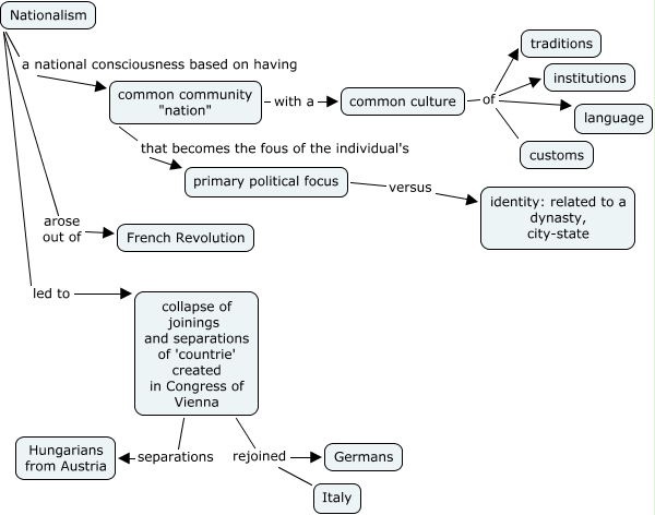 Nationalism, primary political focus versus identity: related to a dynasty, city-state, common community "nation" with a common culture, Nationalism led to collapse of joinings and separations of 'countrie' created in Congress of Vienna, Nationalism a national consciousness based on having common community "nation", Nationalism arose out of French Revolution, common culture of language, common culture of traditions, collapse of joinings and separations of 'countrie' created in Congress of Vienna rejoined Italy, common community "nation" that becomes the fous of the individual's primary political focus, common culture of institutions
