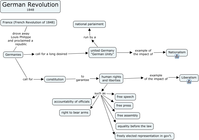 German Revolution 1848, human rights and liberties such as free speech, united Germany "German Unity" example of the impact of Nationalism, France (French Revolution of 1848) drove away Louis Philippe and proclaimed a republic Germanies, human rights and liberties such as equality before the law, human rights and liberties such as freely elected representation in gov't., human rights and liberties example of the impact of Liberalism, human rights and liberties such as free press, Germanies call for constitution, constitution to garantee human rights and liberties, human rights and liberties such as free assembly