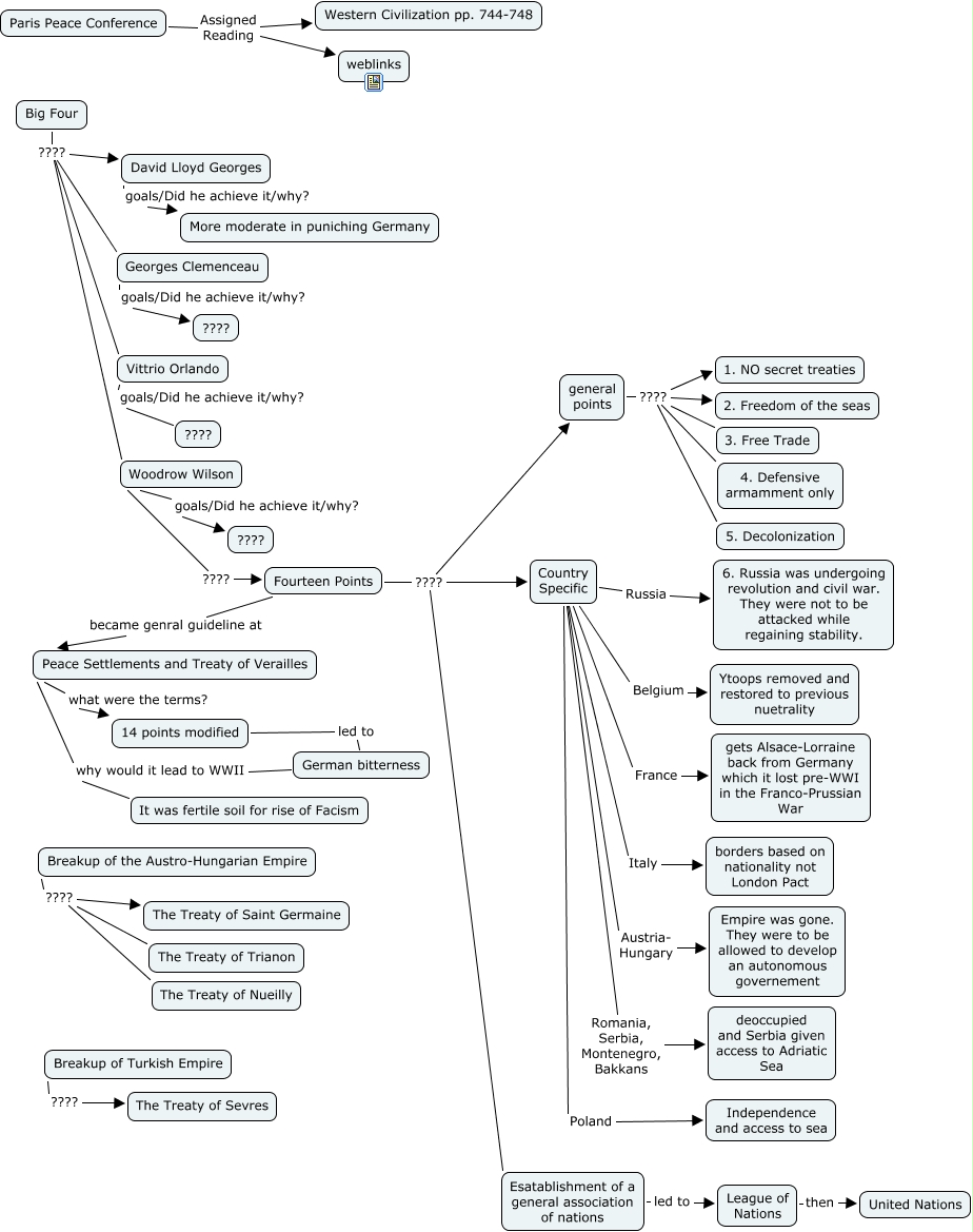 03 Paris Peace Conference, Country Specific Poland Independence and access to sea, Peace Settlements and Treaty of Verailles what were the terms? 14 points modified, Country Specific Italy borders based on nationality not London Pact, Big Four ???? Vittrio Orlando, Country Specific Belgium Ytoops removed and restored to previous nuetrality, Esatablishment of a general association of nations led to League of Nations, Woodrow Wilson goals/Did he achieve it/why? ????, Big Four ???? David Lloyd Georges, Fourteen Points ???? Country Specific, Vittrio Orlando goals/Did he achieve it/why? ????