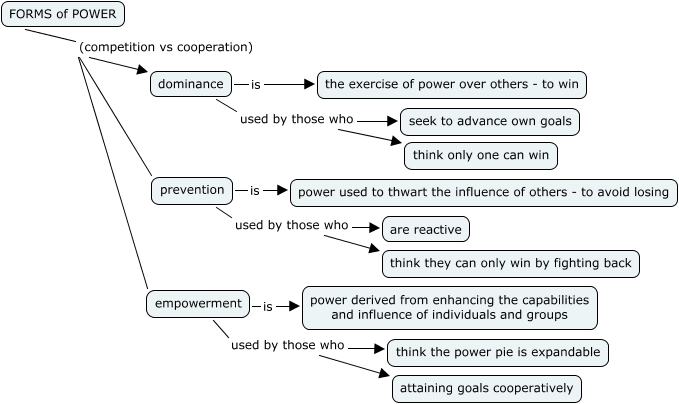 01 Forms of Power, empowerment used by those who think the power pie is expandable, FORMS of POWER (competition vs cooperation) dominance, dominance used by those who seek to advance own goals, FORMS of POWER (competition vs cooperation) prevention, dominance used by those who think only one can win, FORMS of POWER (competition vs cooperation) empowerment, prevention used by those who are reactive, dominance is the exercise of power over others - to win, empowerment used by those who attaining goals cooperatively, empowerment is power derived from enhancing the capabilities and influence of individuals and groups