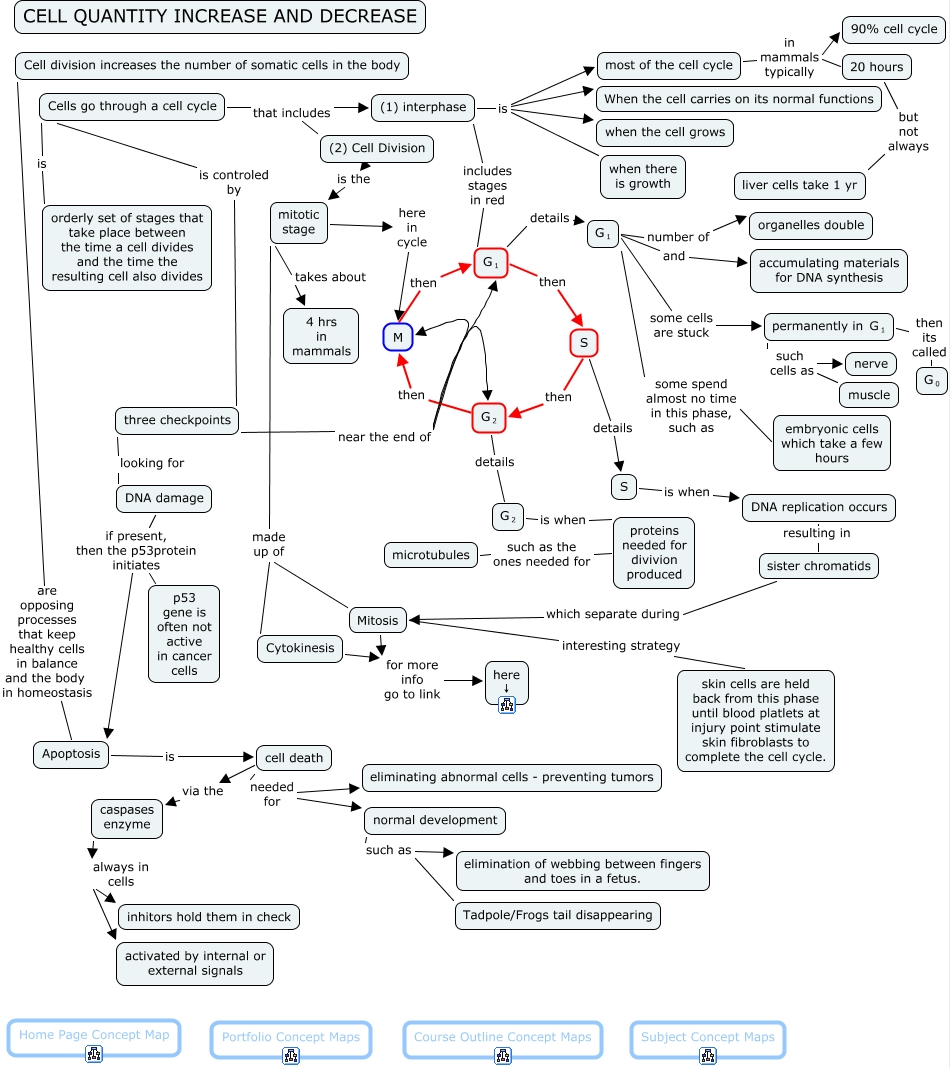 This Concept Map, created with IHMC CmapTools, has information related to: 01 Cell Quantity Increase and Decrease, Cells go through a cell cycle is controled by three checkpoints, <math xmlns="http://www.w3.org/1998/Math/MathML"> <mrow> <mmultiscripts> <mtext> G </mtext> <mtext> 1 </mtext> <none/> </mmultiscripts> </mrow> </math> number of organelles double, S is when DNA replication occurs, (1) interphase includes stages in red <math xmlns="http://www.w3.org/1998/Math/MathML"> <mrow> <mmultiscripts> <mtext> G </mtext> <mtext> 1 </mtext> <none/> </mmultiscripts> </mrow> </math>, Cell division increases the number of somatic cells in the body are opposing processes that keep healthy cells in balance and the body in homeostasis Apoptosis, three checkpoints near the end of M, caspases enzyme always in cells inhitors hold them in check, <math xmlns="http://www.w3.org/1998/Math/MathML"> <mrow> <mmultiscripts> <mtext> G </mtext> <mtext> 2 </mtext> <none/> </mmultiscripts> </mrow> </math> is when proteins needed for divivion produced, cell death needed for eliminating abnormal cells - preventing tumors, cell death via the caspases enzyme, Cytokinesis for more info go to link here ↓, M then <math xmlns="http://www.w3.org/1998/Math/MathML"> <mrow> <mmultiscripts> <mtext> G </mtext> <mtext> 1 </mtext> <none/> </mmultiscripts> </mrow> </math>, most of the cell cycle in mammals typically 20 hours, DNA damage if present, then the p53protein initiates Apoptosis, normal development such as Tadpole/Frogs tail disappearing, <math xmlns="http://www.w3.org/1998/Math/MathML"> <mrow> <mmultiscripts> <mtext> G </mtext> <mtext> 2 </mtext> <none/> </mmultiscripts> </mrow> </math> details <math xmlns="http://www.w3.org/1998/Math/MathML"> <mrow> <mmultiscripts> <mtext> G </mtext> <mtext> 2 </mtext> <none/> </mmultiscripts> </mrow> </math>, <math xmlns="http://www.w3.org/1998/Math/MathML"> <mrow> <mmultiscripts> <mtext> G </mtext> <mtext> 2 </mtext> <none/> </mmultiscripts> </mrow> </math> then M, mitotic stage made up of Mitosis, S details S, cell death needed for normal development