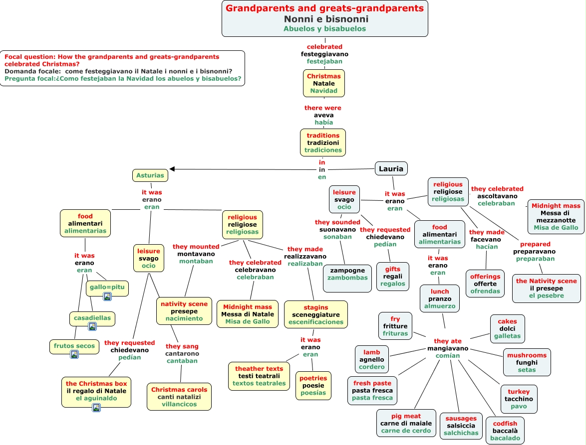 nonni e bisnonni, lunch pranzo almuerzo they ate mangiavano comían lamb agnello cordero, leisure svago ocio they requested chiedevano pedían the Christmas box il regalo di Natale el aguinaldo, leisure svago ocio they requested chiedevano pedían the Christmas box il regalo di Natale el aguinaldo, stagins sceneggiature escenificaciones it was erano eran theather texts testi teatrali textos teatrales, food alimentari alimentarias it was erano eran frutos secos, lunch pranzo almuerzo they ate mangiavano comían turkey tacchino pavo, Lauria it was erano eran religious religiose religiosas, Asturias it was erano eran religious religiose religiosas, religious religiose religiosas they celebrated ascoltavano celebraban Midnight mass Messa di mezzanotte Misa de Gallo, traditions tradizioni tradiciones in in en Lauria