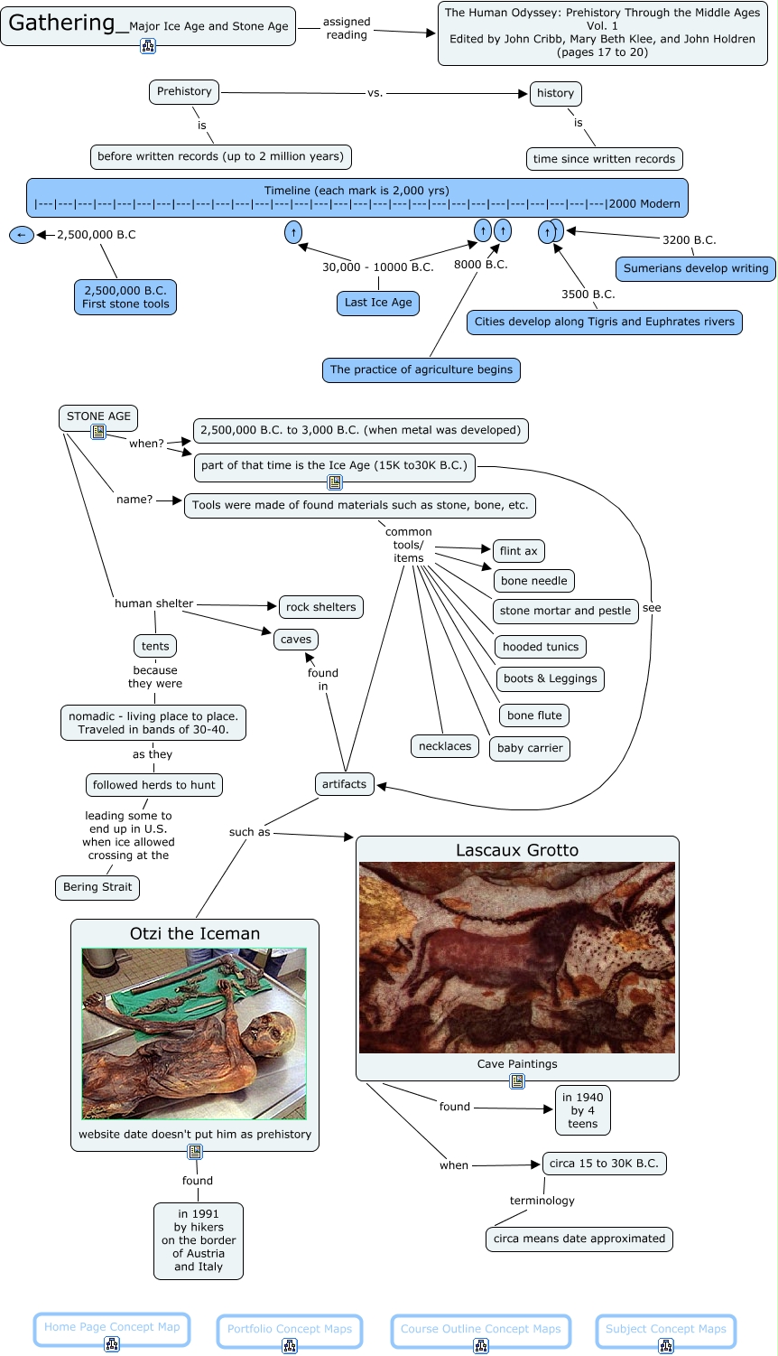 This Concept Map, created with IHMC CmapTools, has information related to: 02 Gathering_Major Ice Age and Stone Age, Tools were made of found materials such as stone, bone, etc. common tools/ items boots & Leggings, Lascaux Grotto Cave Paintings when circa 15 to 30K B.C., STONE AGE when? part of that time is the Ice Age (15K to30K B.C.), nomadic - living place to place. Traveled in bands of 30-40. as they followed herds to hunt, Prehistory vs. history, Lascaux Grotto Cave Paintings found in 1940 by 4 teens, artifacts such as Lascaux Grotto Cave Paintings, Prehistory is before written records (up to 2 million years), followed herds to hunt leading some to end up in U.S. when ice allowed crossing at the Bering Strait, part of that time is the Ice Age (15K to30K B.C.) see artifacts, Cities develop along Tigris and Euphrates rivers 3500 B.C. ↑, circa 15 to 30K B.C. terminology circa means date approximated, history is time since written records, STONE AGE when? 2,500,000 B.C. to 3,000 B.C. (when metal was developed), Tools were made of found materials such as stone, bone, etc. common tools/ items hooded tunics, Tools were made of found materials such as stone, bone, etc. common tools/ items necklaces, Tools were made of found materials such as stone, bone, etc. common tools/ items bone needle, Tools were made of found materials such as stone, bone, etc. common tools/ items flint ax, STONE AGE name? Tools were made of found materials such as stone, bone, etc., Sumerians develop writing 3200 B.C. ↑