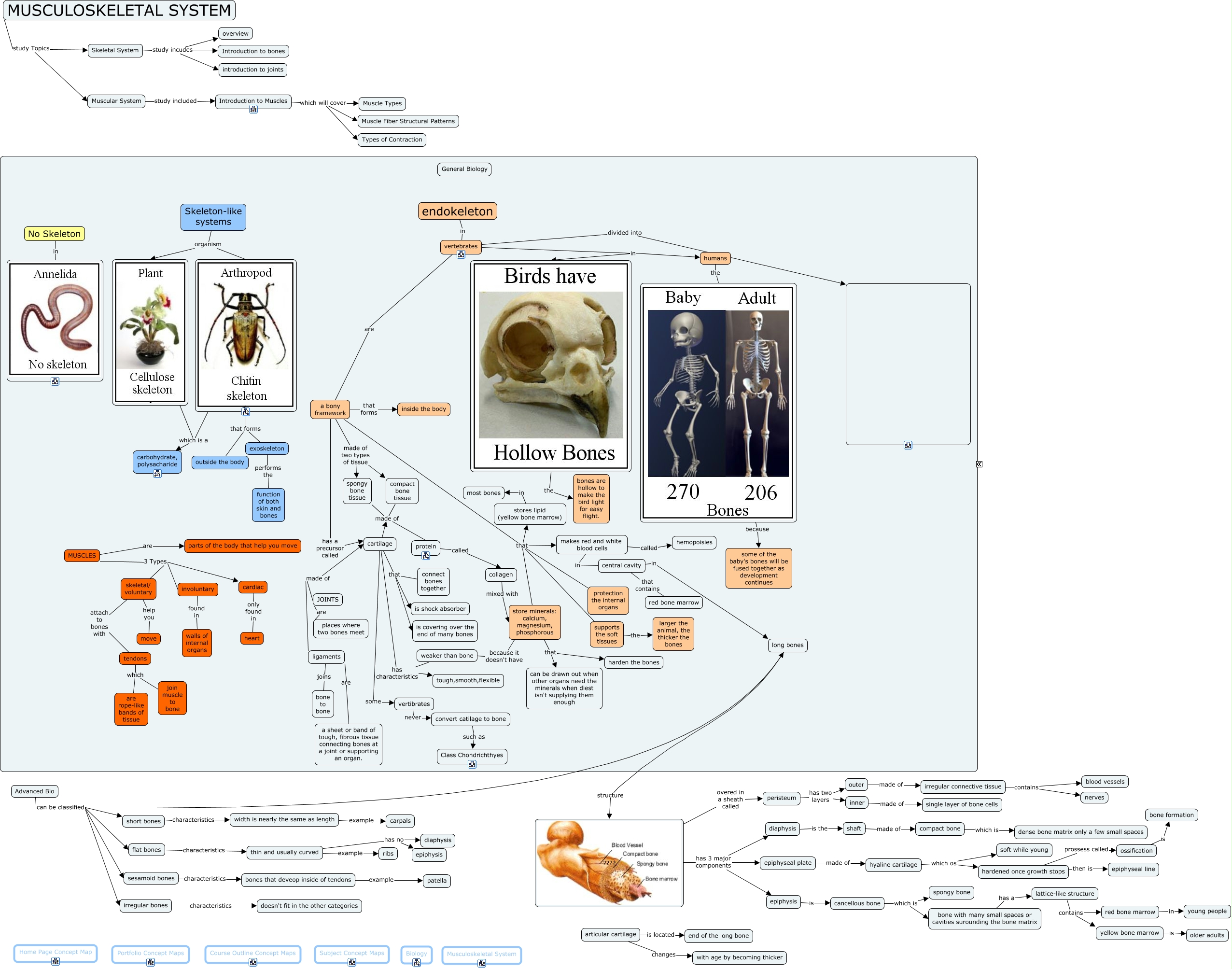 This Concept Map, created with IHMC CmapTools, has information related to: 01_01_Musculoskeletal System, JOINTS made of cartilage, store minerals: calcium, magnesium, phosphorous that can be drawn out when other organs need the minerals when diest isn't supplying them enough, cartilage some vertibrates, a bony framework that store minerals: calcium, magnesium, phosphorous, exoskeleton performs the function of both skin and bones, a bony framework that stores lipid (yellow bone marrow), Muscular System study included Introduction to Muscles, shaft made of compact bone, hardened once growth stops then is epiphyseal line, irregular connective tissue contains blood vessels, cancellous bone which is spongy bone, cartilage made of protein, cartilage has characteristics weaker than bone, diaphysis is the shaft, hyaline cartilage which os hardened once growth stops, cartilage that is shock absorber, thin and usually curved example ribs, yellow bone marrow is older adults, Skeletal System study incudes introduction to joints, weaker than bone because it doesn't have store minerals: calcium, magnesium, phosphorous