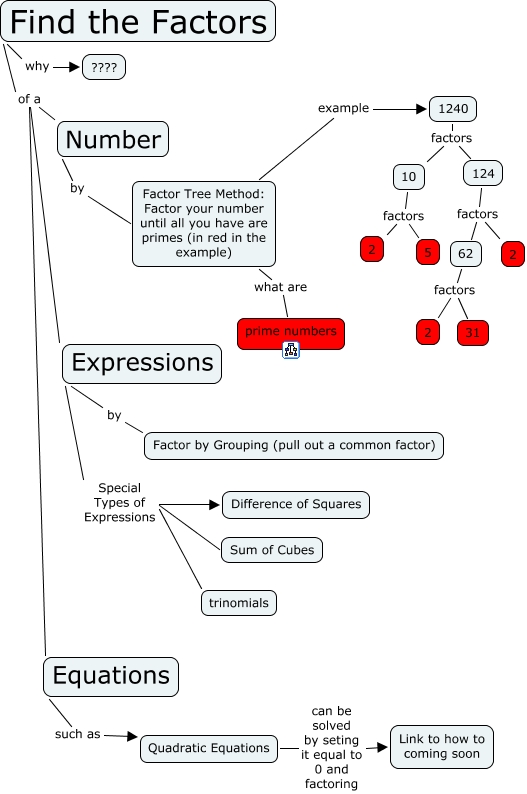 Factoring, Quadratic Equations can be solved by seting it equal to 0 and factoring Link to how to coming soon, Expressions Special Types of Expressions trinomials, Find the Factors of a Number, Number by Factor Tree Method: Factor your number until all you have are primes (in red in the example), Expressions by Factor by Grouping (pull out a common factor), Find the Factors of a Expressions, Factor Tree Method: Factor your number until all you have are primes (in red in the example) example 1240, Expressions Special Types of Expressions Difference of Squares, Equations such as Quadratic Equations, 1240 factors 124