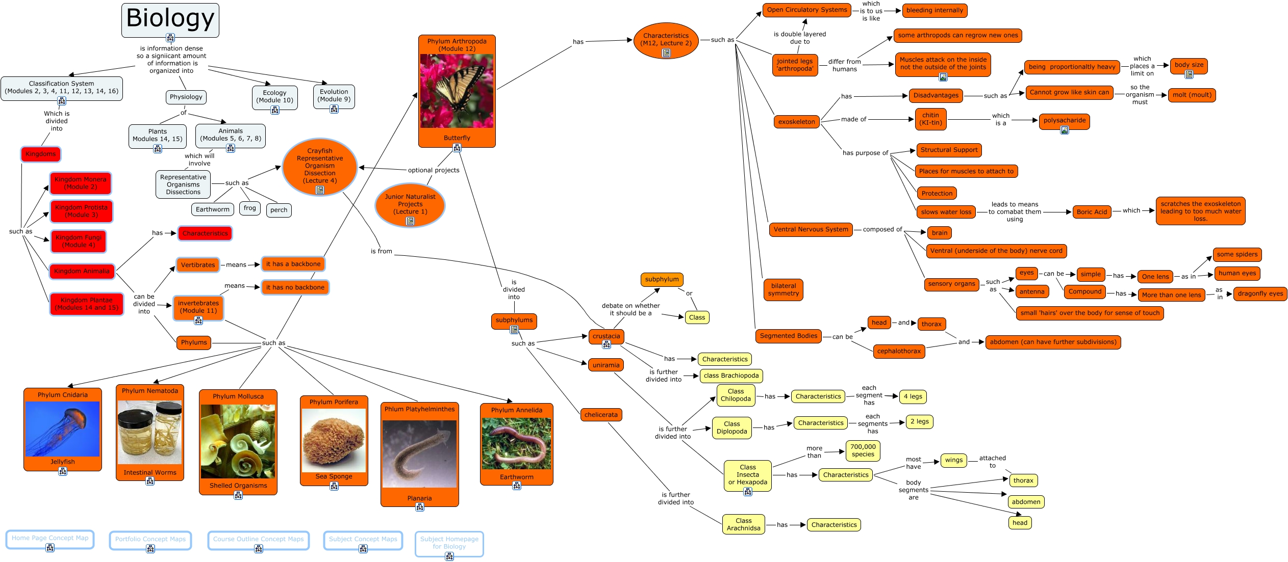 This Concept Map, created with IHMC CmapTools, has information related to: Arthropods, Characteristics each segments has 2 legs, One lens as in human eyes, Characteristics most have wings, Characteristics body segments are abdomen, Open Circulatory Systems which is to us is like bleeding internally, exoskeleton has purpose of Protection, Characteristics (M12, Lecture 2) such as Open Circulatory Systems, crustacia debate on whether it should be a Class, Classification System (Modules 2, 3, 4, 11, 12, 13, 14, 16) Which is divided into Kingdoms, Kingdoms such as Kingdom Animalia, Ventral Nervous System composed of Ventral (underside of the body) nerve cord, exoskeleton has purpose of Structural Support, invertebrates (Module 11) such as Phylum Mollusca Shelled Organisms, Phylums such as Phylum Porifera Sea Sponge, sensory organs such as small 'hairs' over the body for sense of touch, Characteristics (M12, Lecture 2) such as Ventral Nervous System, cephalothorax and abdomen (can have further subdivisions), Class Arachnidsa has Characteristics, Kingdoms such as Kingdom Protista (Module 3), Phylum Arthropoda (Module 12) Butterfly has Characteristics (M12, Lecture 2)
